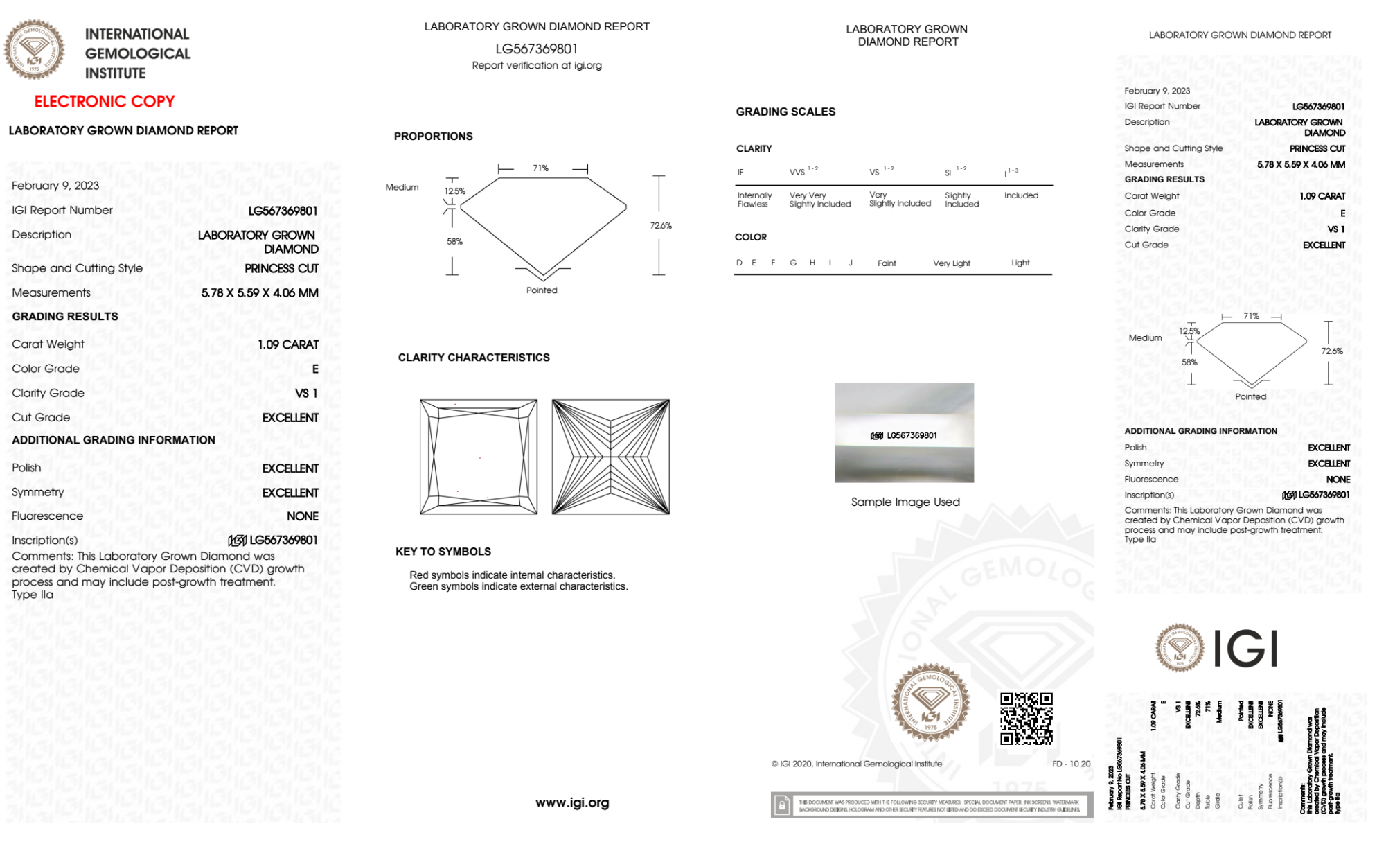 Your 1.09 carat Princess lab diamond is graded E color (Colorless), and you can read more about E color diamonds here.