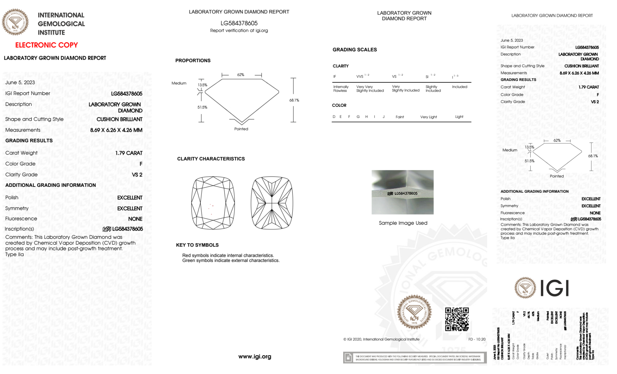 Your 1.79 carat Cushion lab diamond is graded F color (Colorless), and you can read more about F color diamonds here.