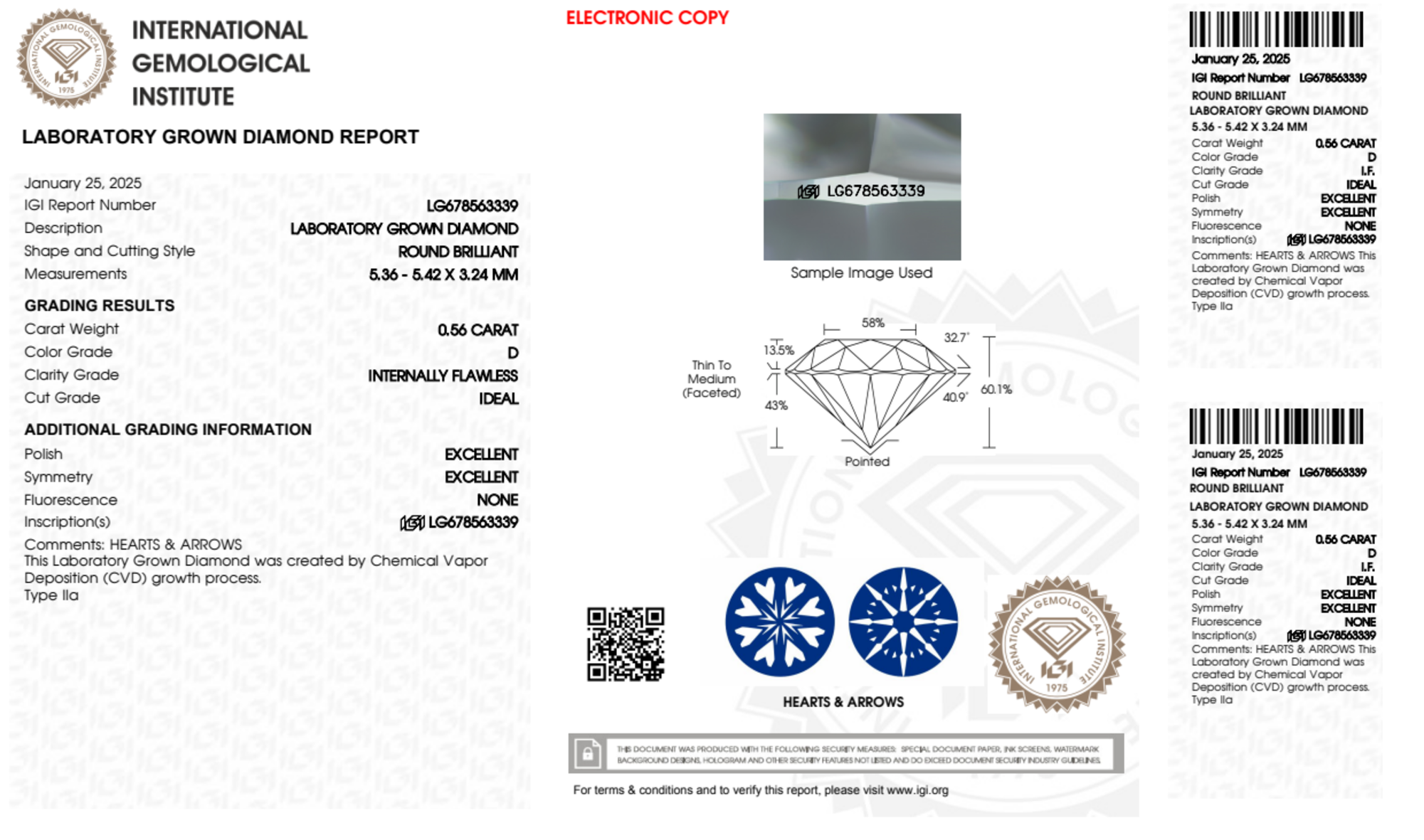 Your 0.56 carat Round lab diamond is graded IF clarity, which stands for Internally Flawless. Read more about IF clarity diamonds here, or learn more about diamond clarity in general here.