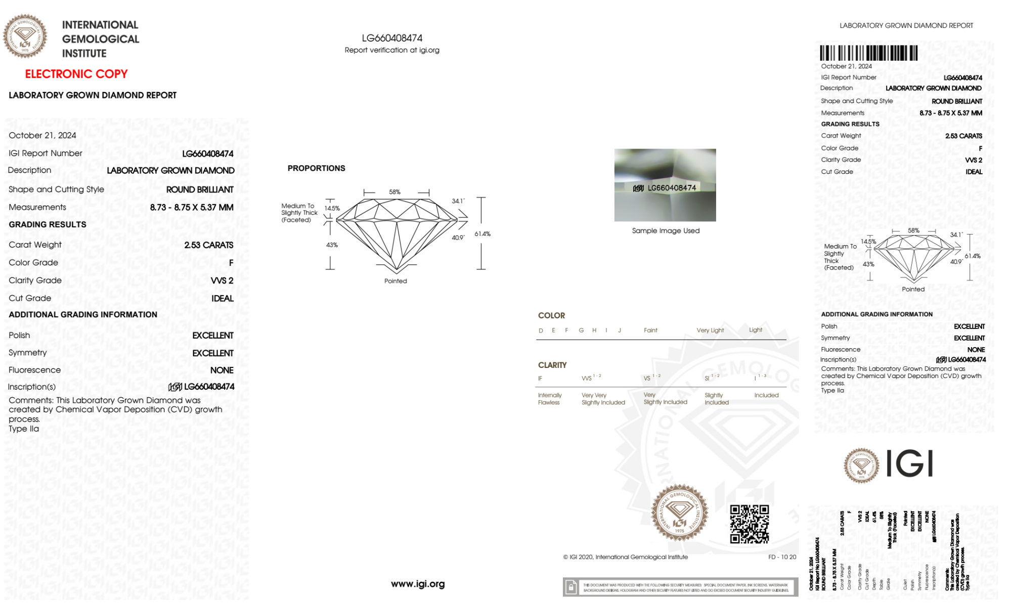 Your 2.53 carat Round lab diamond is graded F color (Colorless), and you can read more about F color diamonds here.
