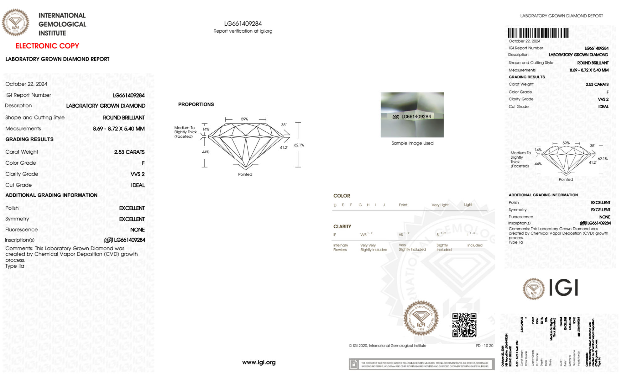 Your 2.53 carat Round lab diamond is graded F color (Colorless), and you can read more about F color diamonds here.