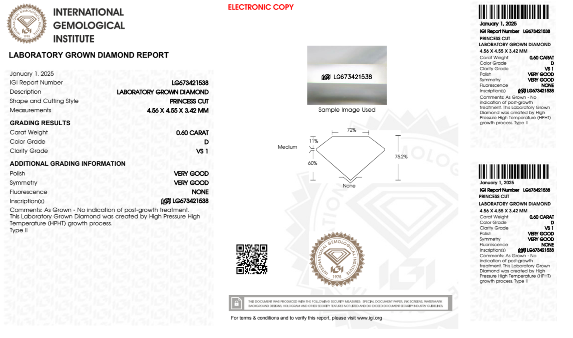 Your 0.60 carat Princess lab diamond is graded D color (Colorless), and you can read more about D color diamonds here.