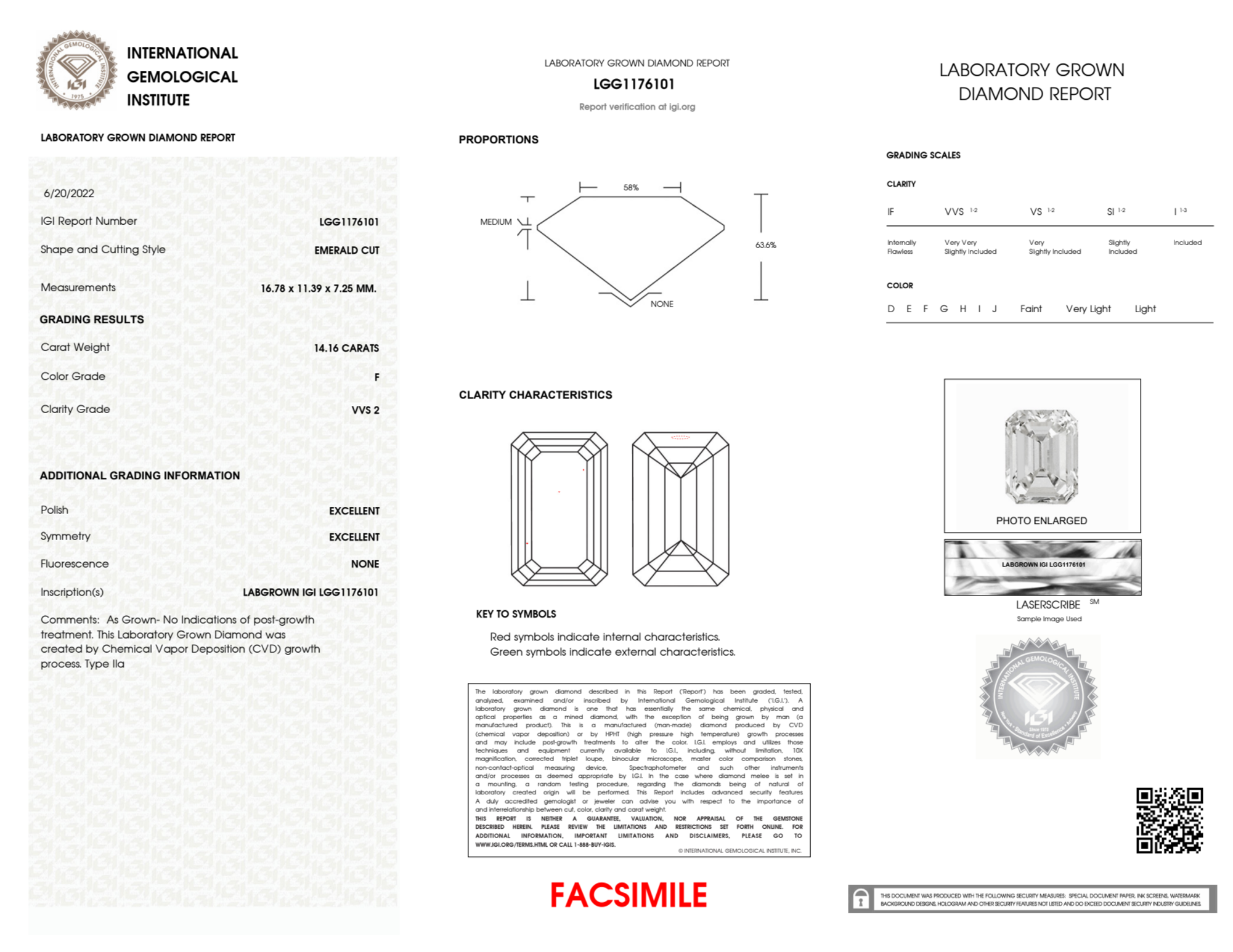 Your 14.16 carat Emerald lab diamond is graded F color (Colorless), and you can read more about F color diamonds here.