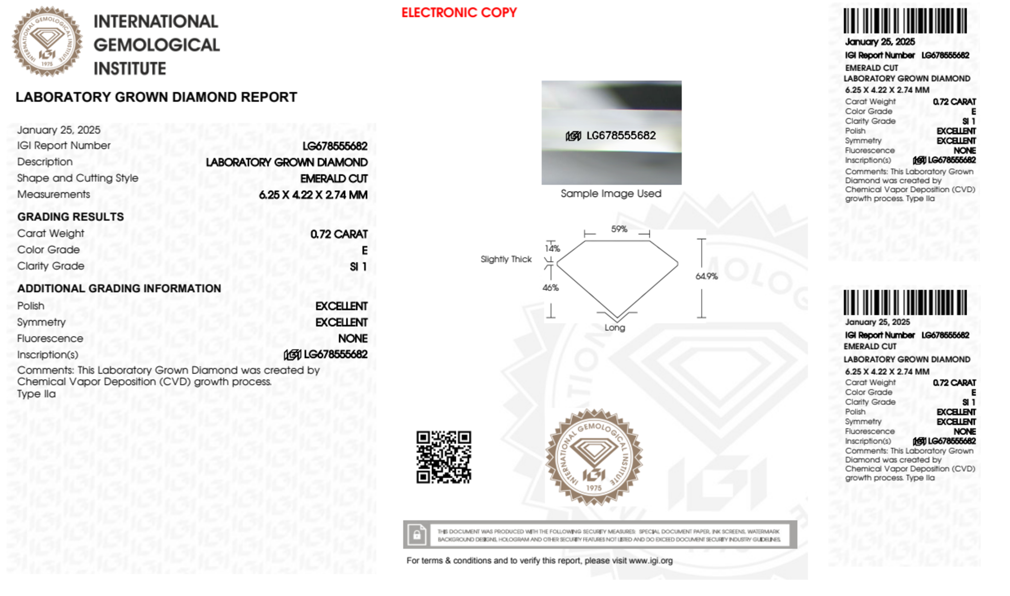 Your 0.72 carat Emerald lab diamond is graded E color (Colorless), and you can read more about E color diamonds here.