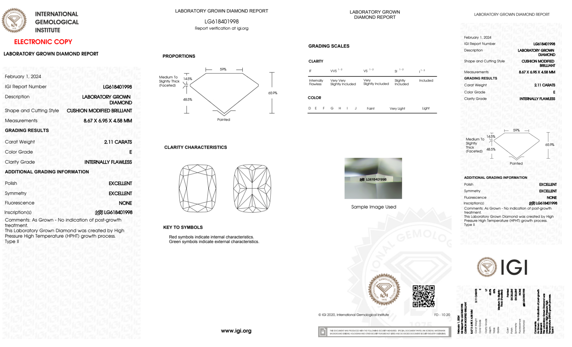Your 2.11 carat Cushion lab diamond is graded E color (Colorless), and you can read more about E color diamonds here.