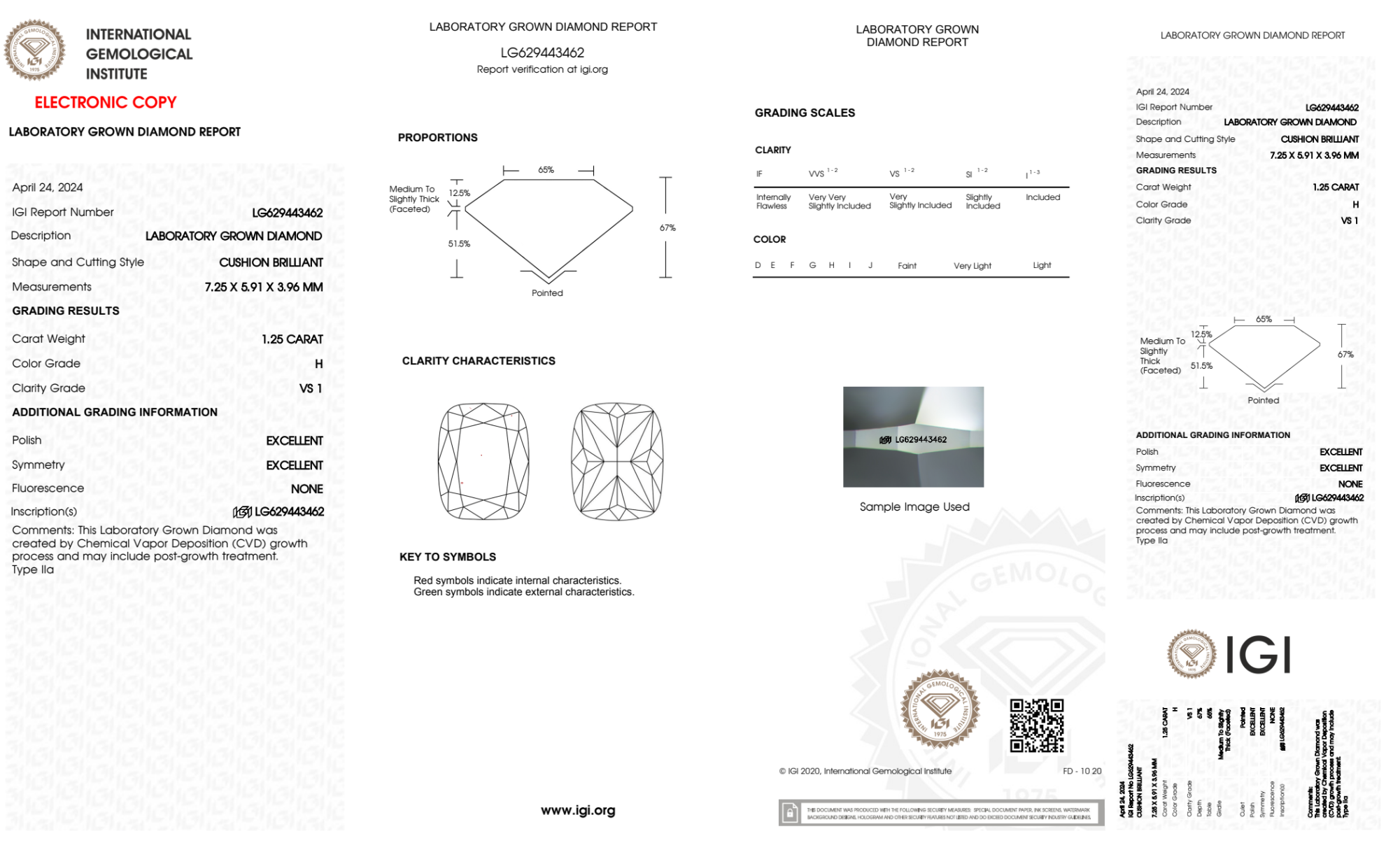 Your 1.25 carat Cushion lab diamond is graded H color (Near Colorless), and you can read more about H color diamonds here.