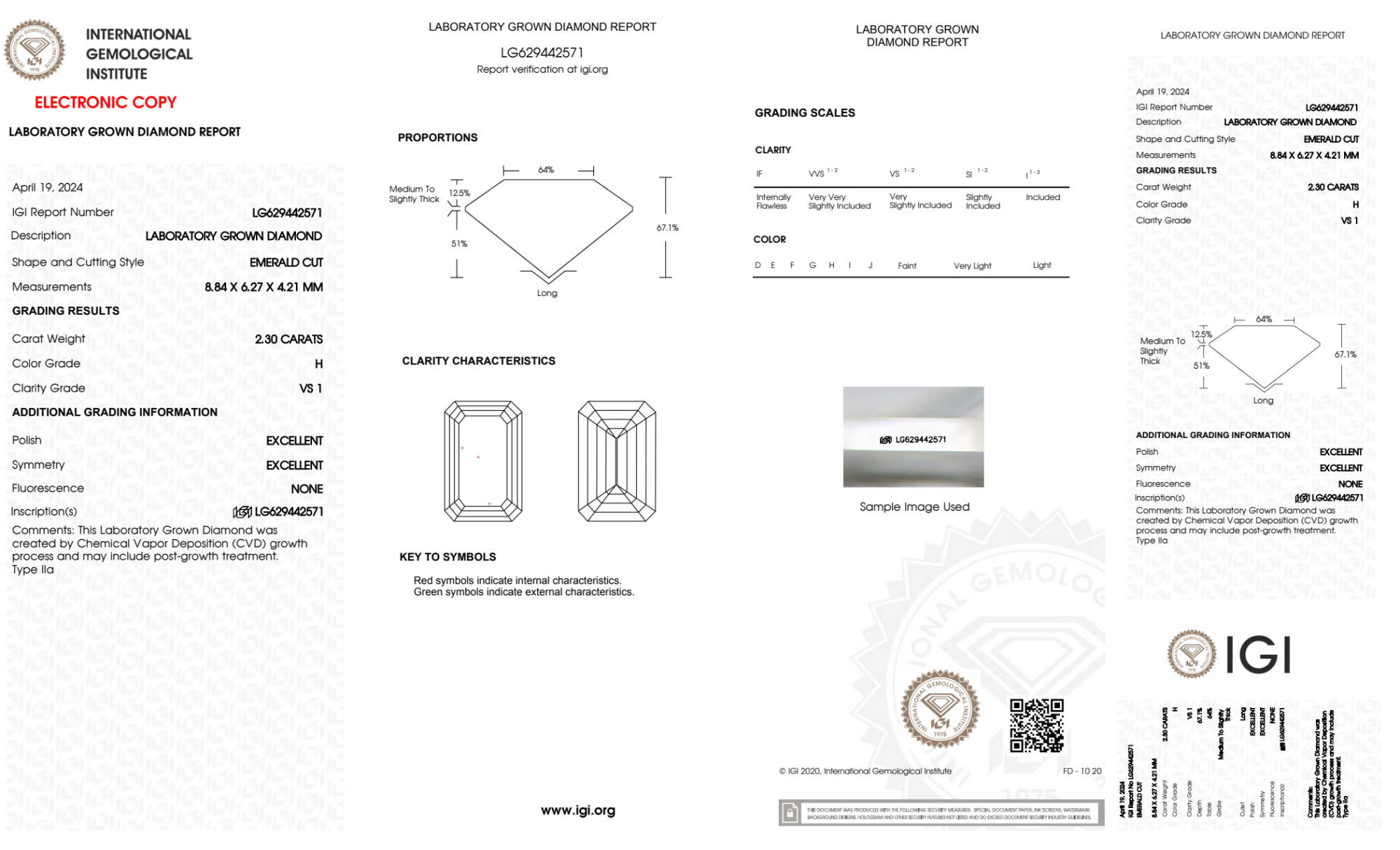 Your 2.30 carat Emerald lab diamond is graded VS1 clarity, which stands for Very Slightly Included 1. Read more about VS1 clarity diamonds here, or learn more about diamond clarity in general here.