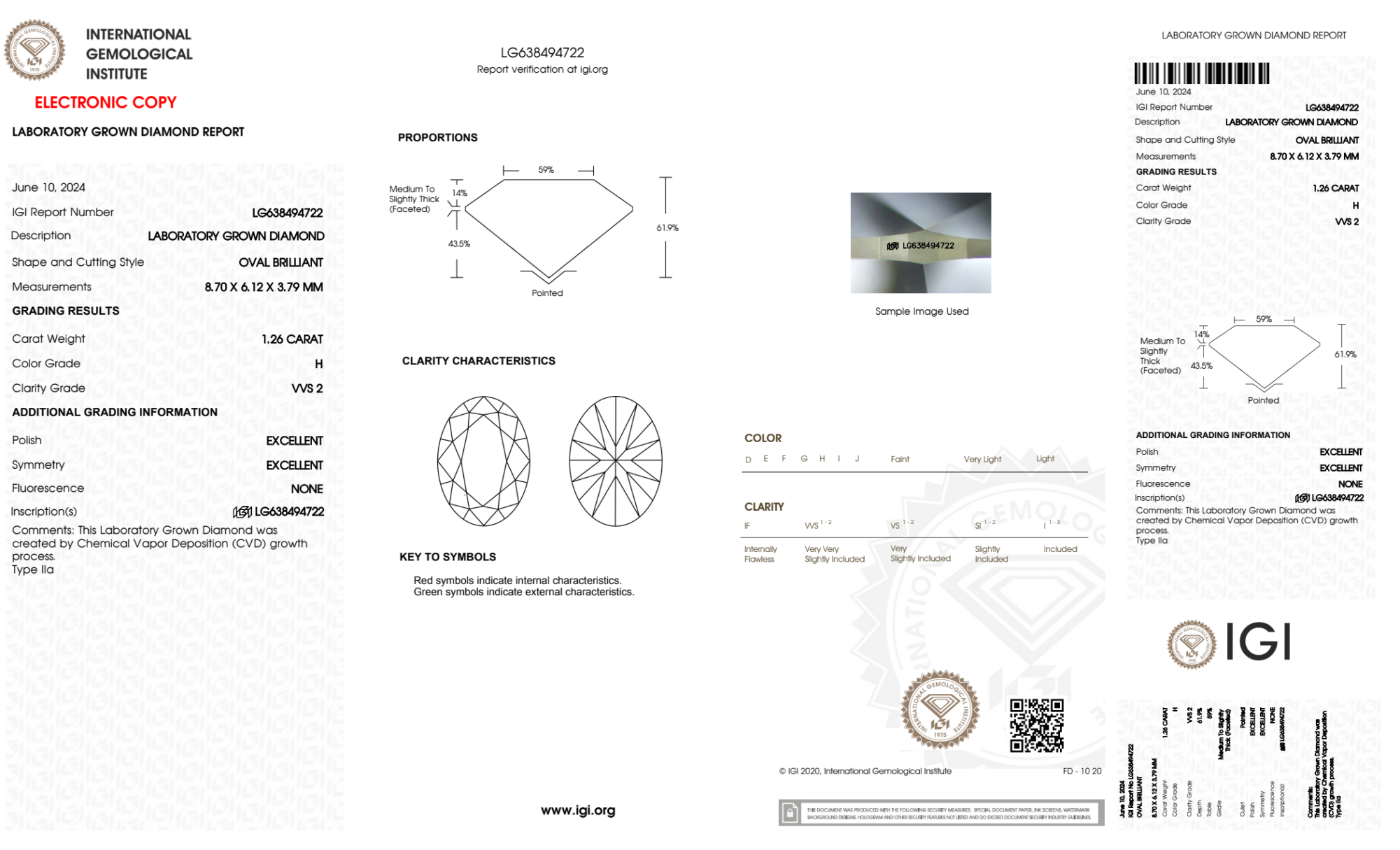 Your 1.26 carat Oval lab diamond is graded H color (Near Colorless), and you can read more about H color diamonds here.