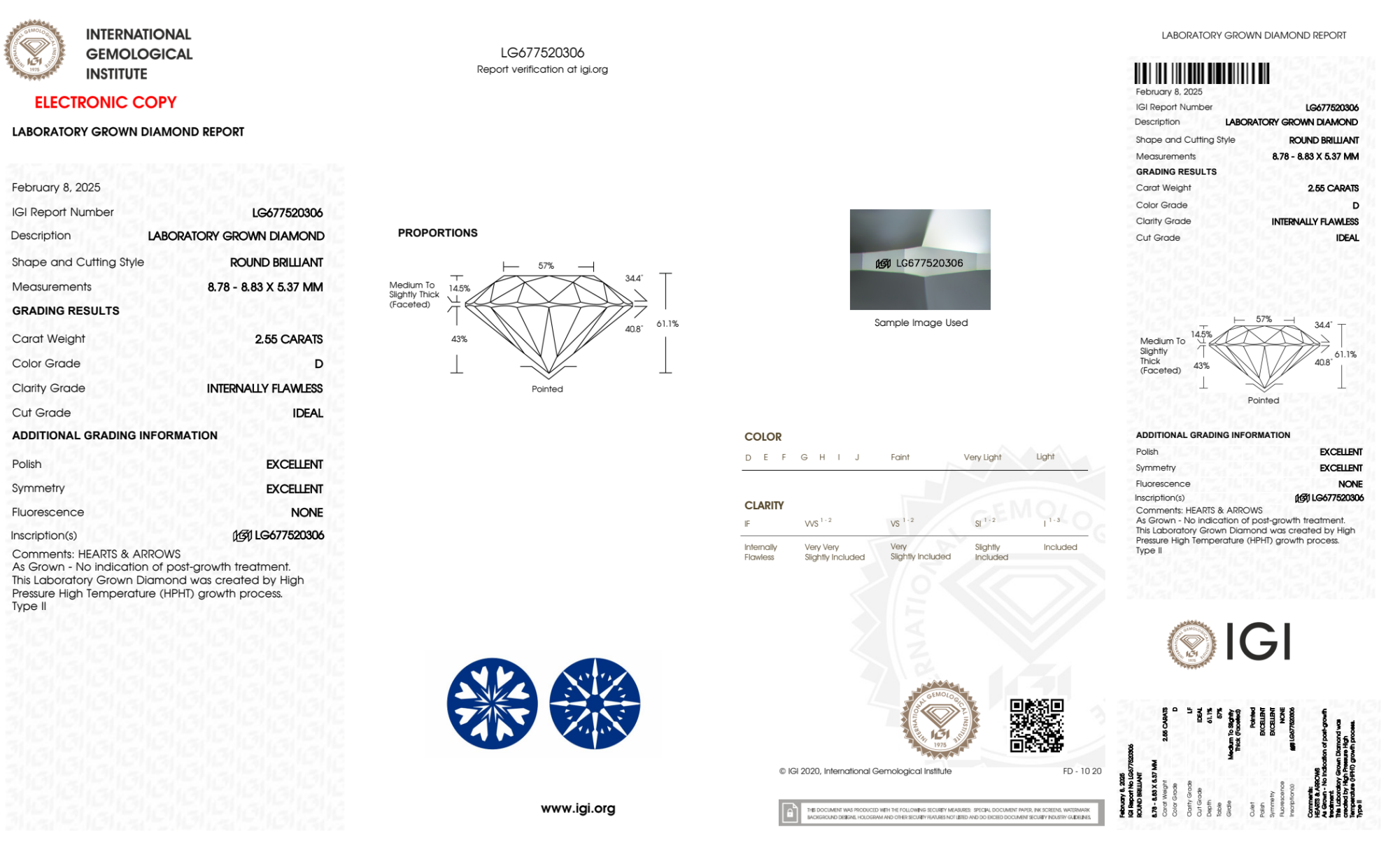 Your 2.55 carat Round lab diamond is graded IF clarity, which stands for Internally Flawless. Read more about IF clarity diamonds here, or learn more about diamond clarity in general here.