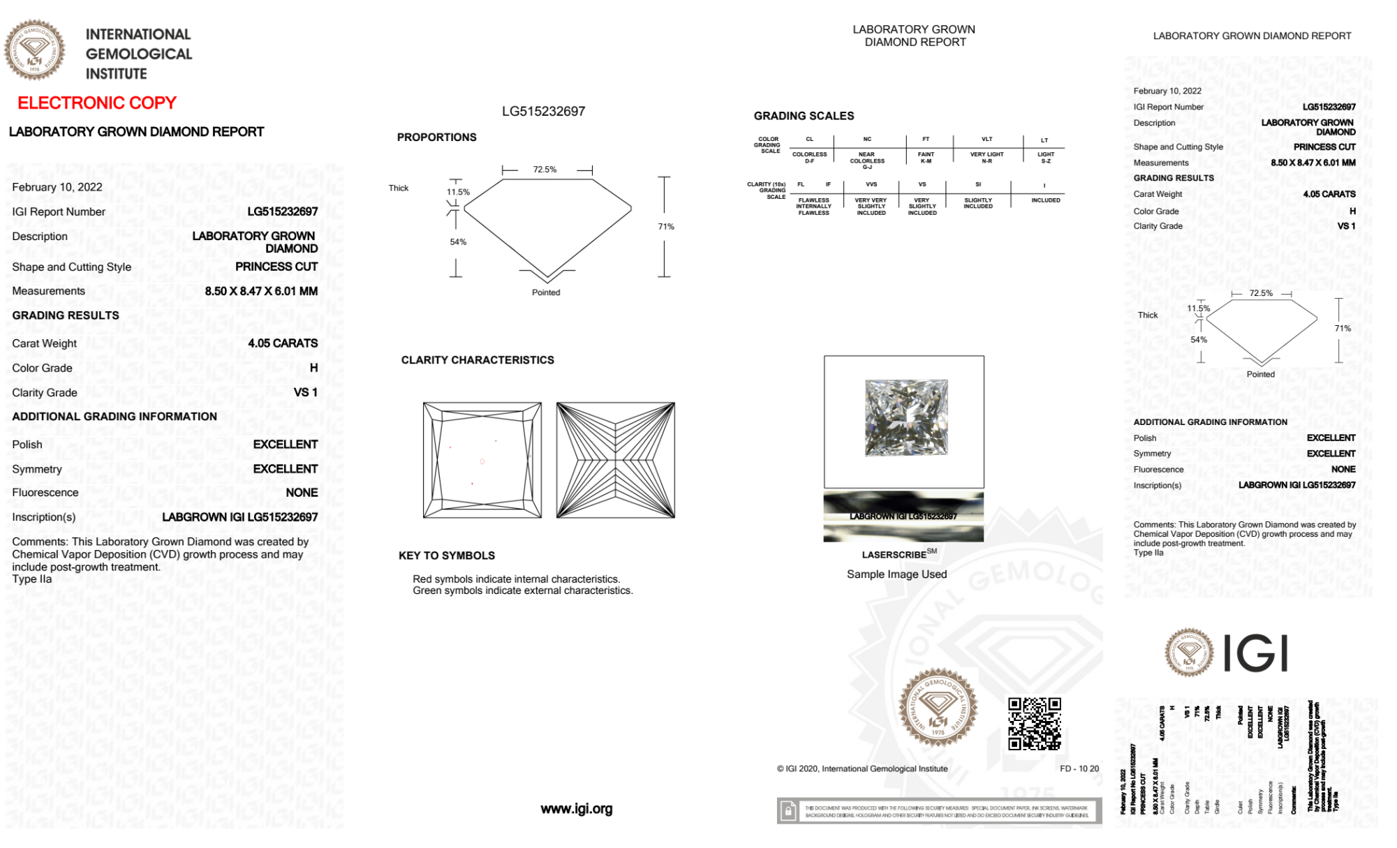 Your 4.05 carat Princess lab diamond is graded H color (Near Colorless), and you can read more about H color diamonds here.