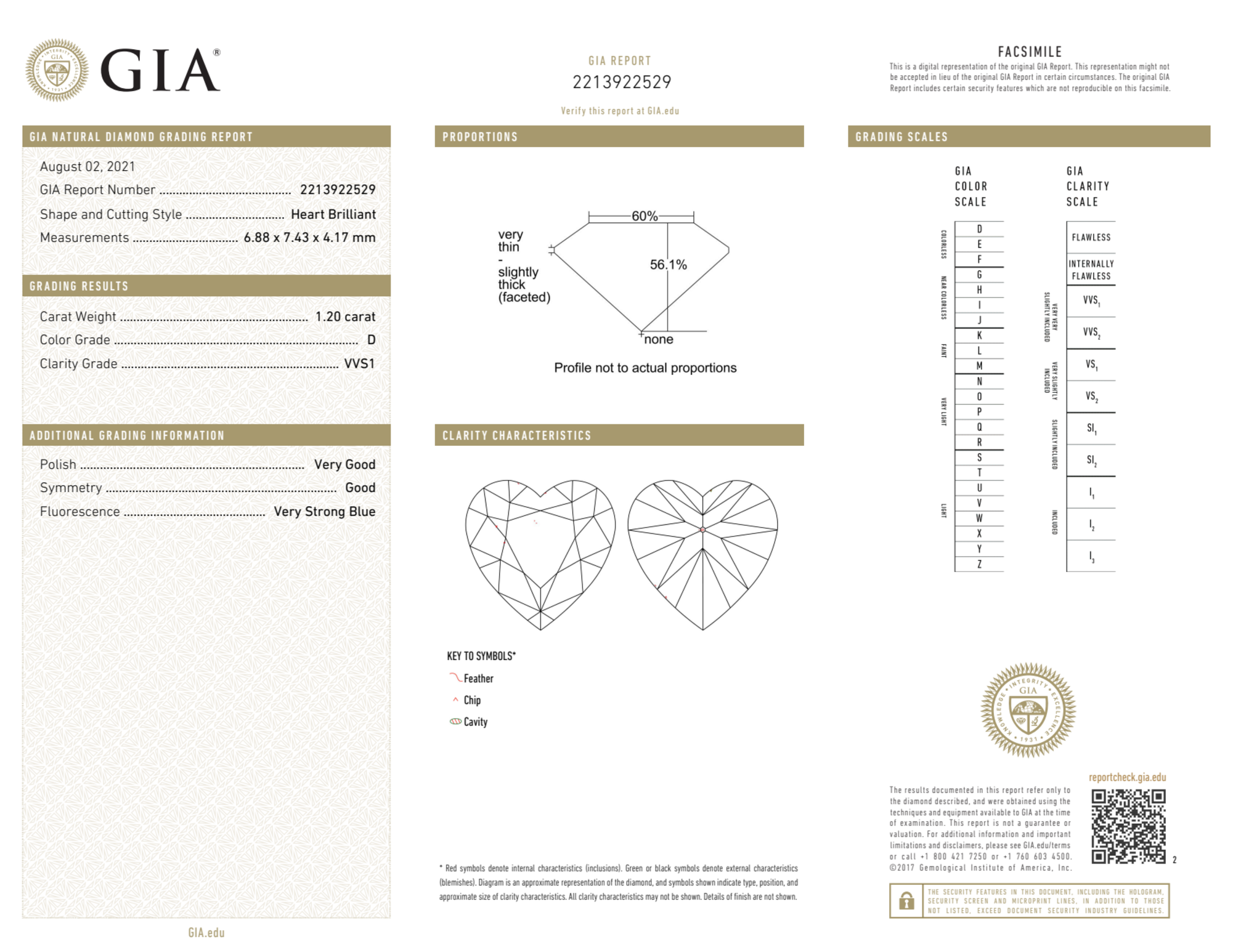 Your 1.20 carat Heart natural diamond is graded VVS1 clarity, which stands for Very Very Slightly Included 1. Read more about VVS1 clarity diamonds here, or learn more about diamond clarity in general here.