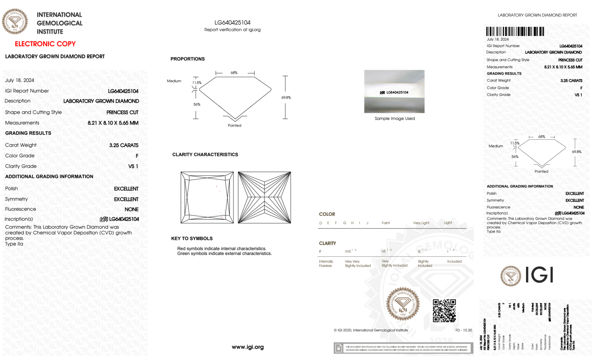 Your 3.25 carat Princess lab diamond is graded F color (Colorless), and you can read more about F color diamonds here.
