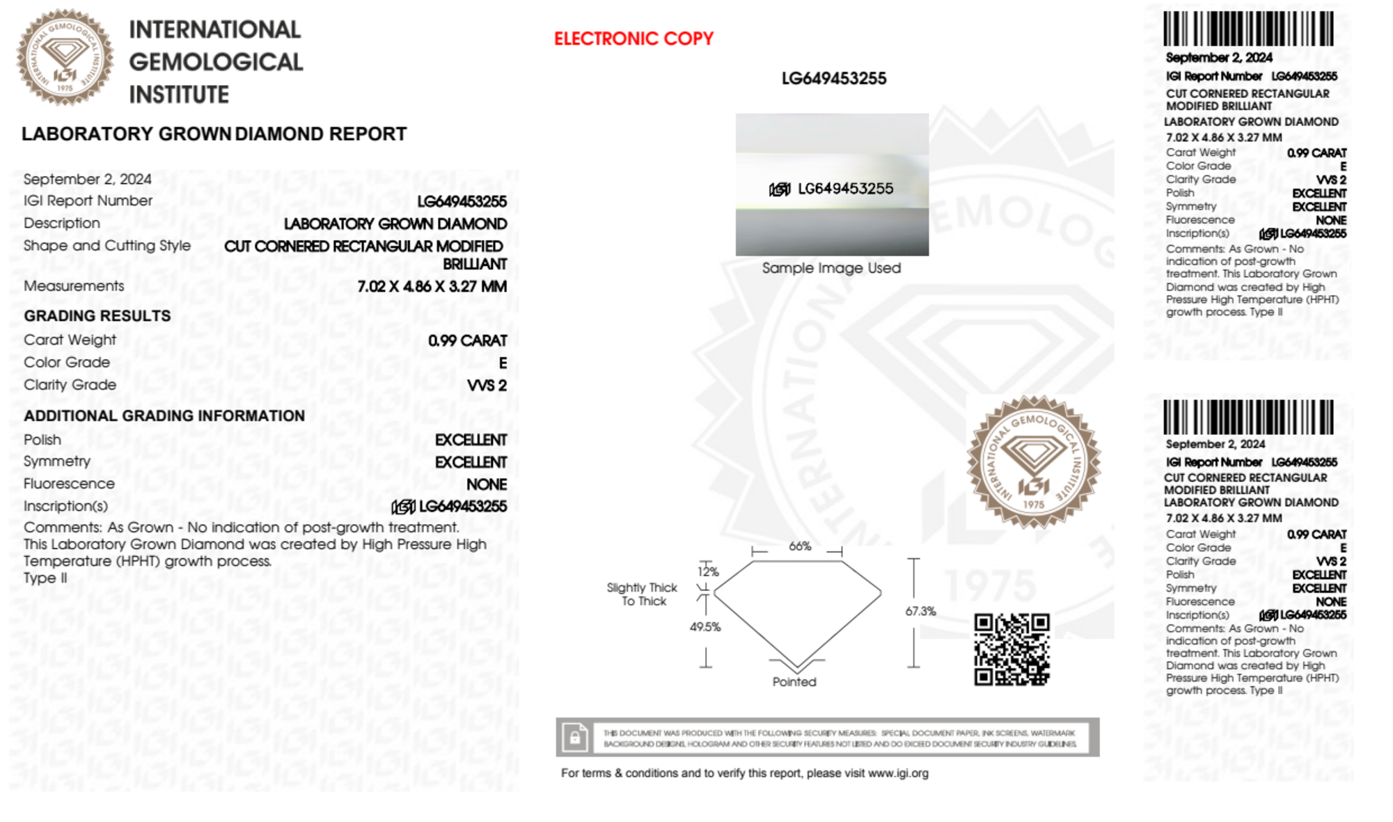 Your 0.99 carat Radiant lab diamond is graded E color (Colorless), and you can read more about E color diamonds here.