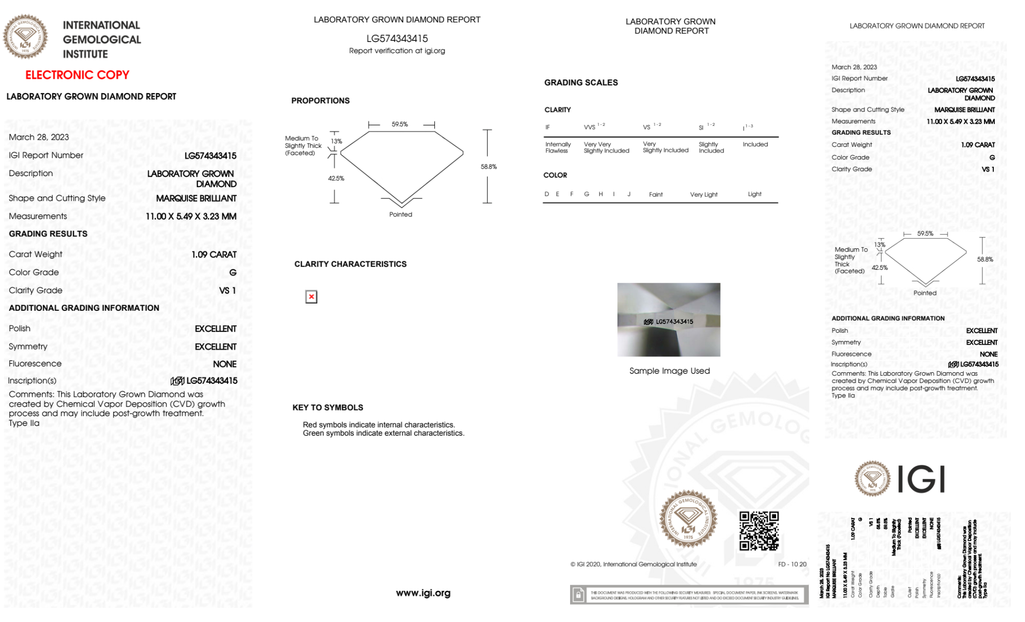 Your 1.09 carat Marquise lab diamond is graded G color (Near Colorless), and you can read more about G color diamonds here.