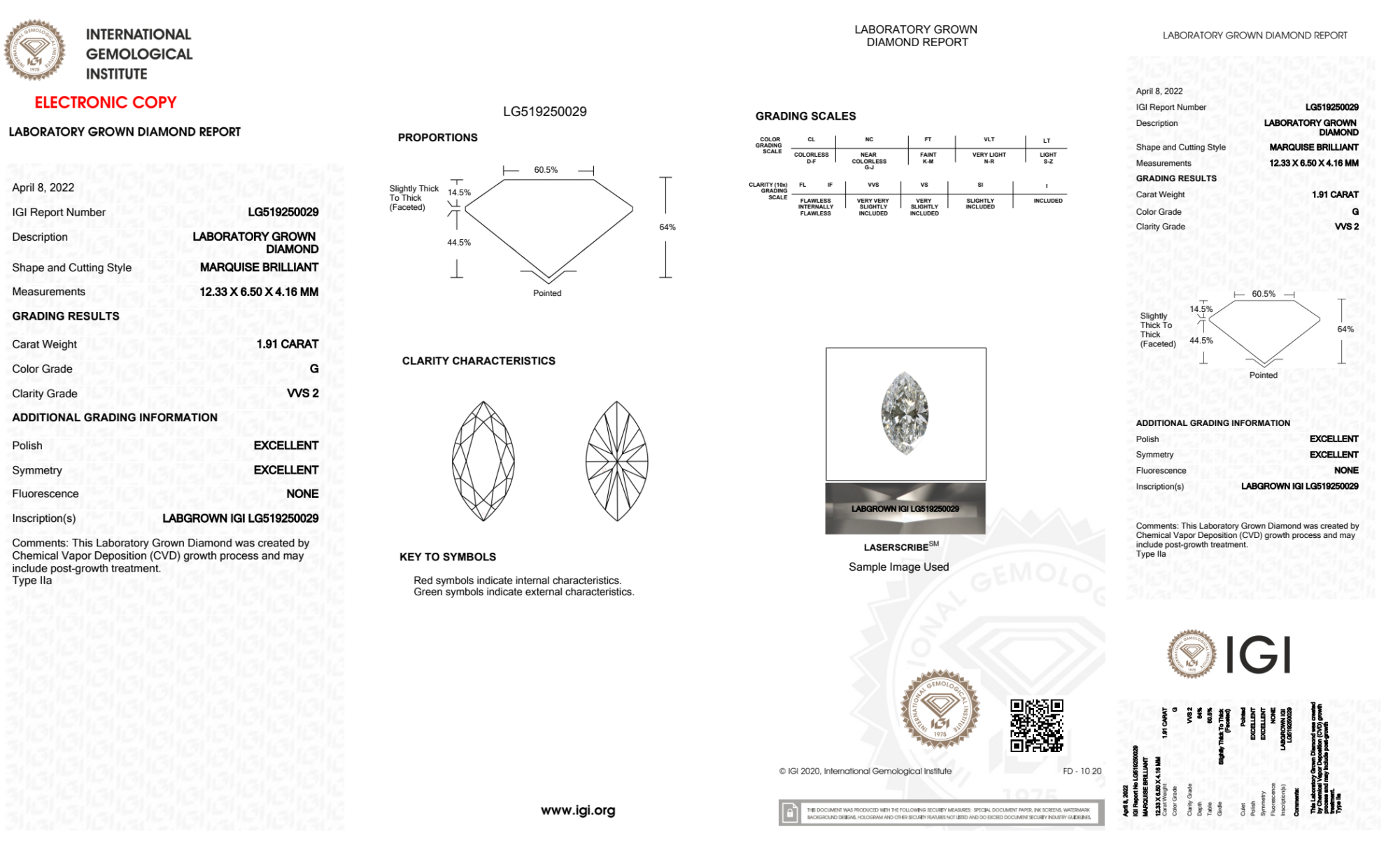 Your 1.91 carat Marquise lab diamond is graded G color (Near Colorless), and you can read more about G color diamonds here.