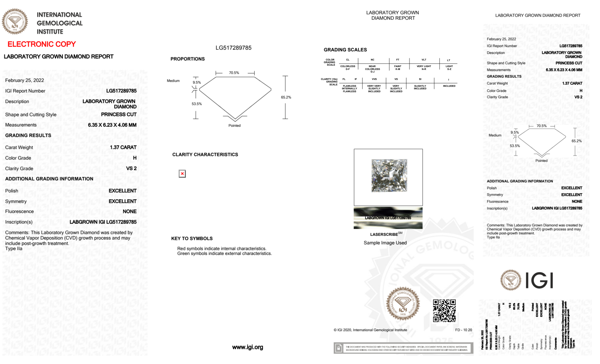 Your 1.37 carat Princess lab diamond is graded H color (Near Colorless), and you can read more about H color diamonds here.