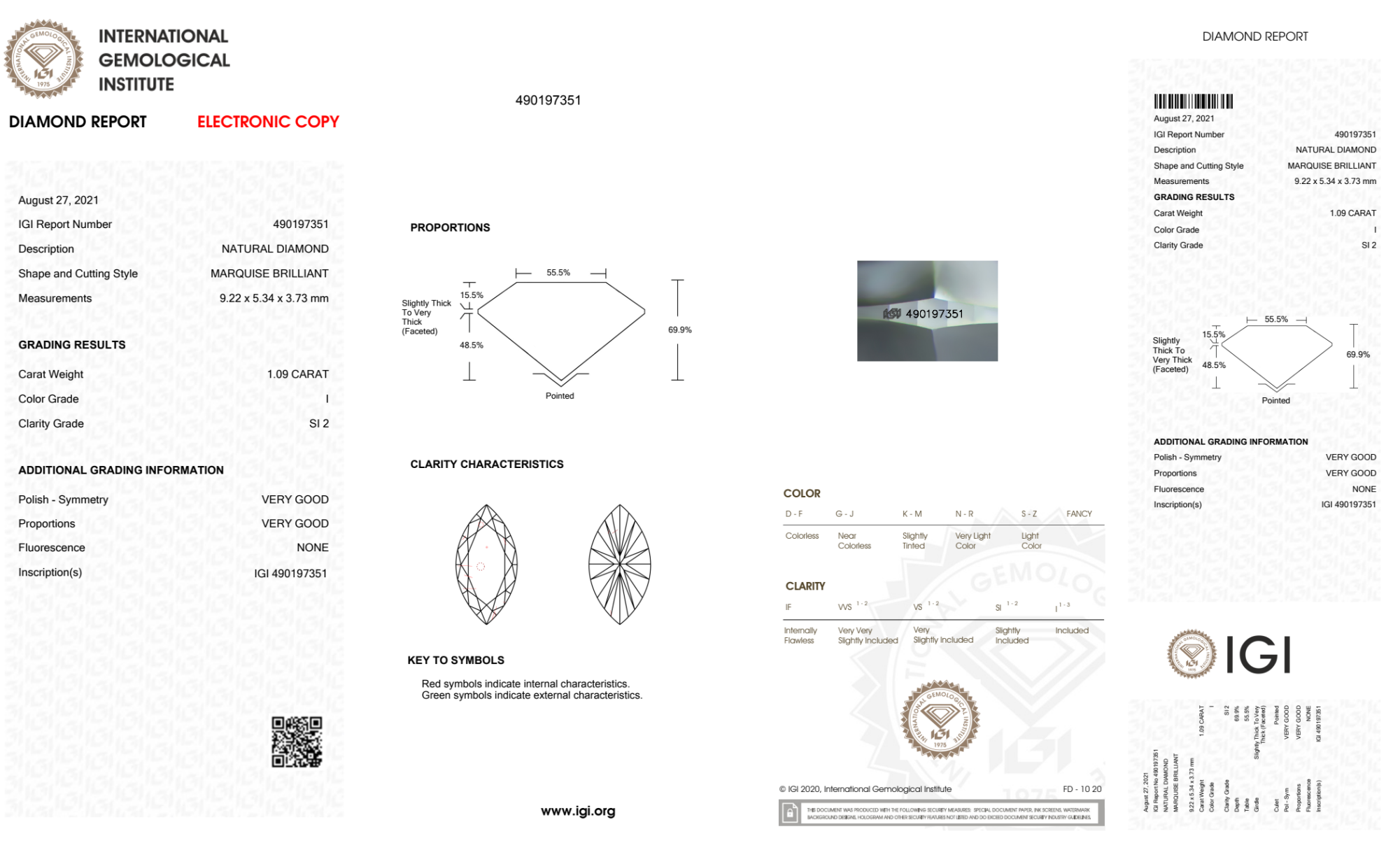 Your 1.09 carat Marquise natural diamond is graded I color (Near Colorless), and you can read more about I color diamonds here.
