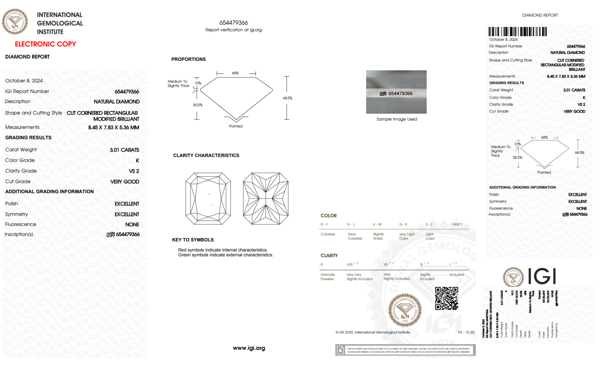 Your 3.01 carat Radiant natural diamond is graded K color (Faint Color), and you can read more about K color diamonds here.