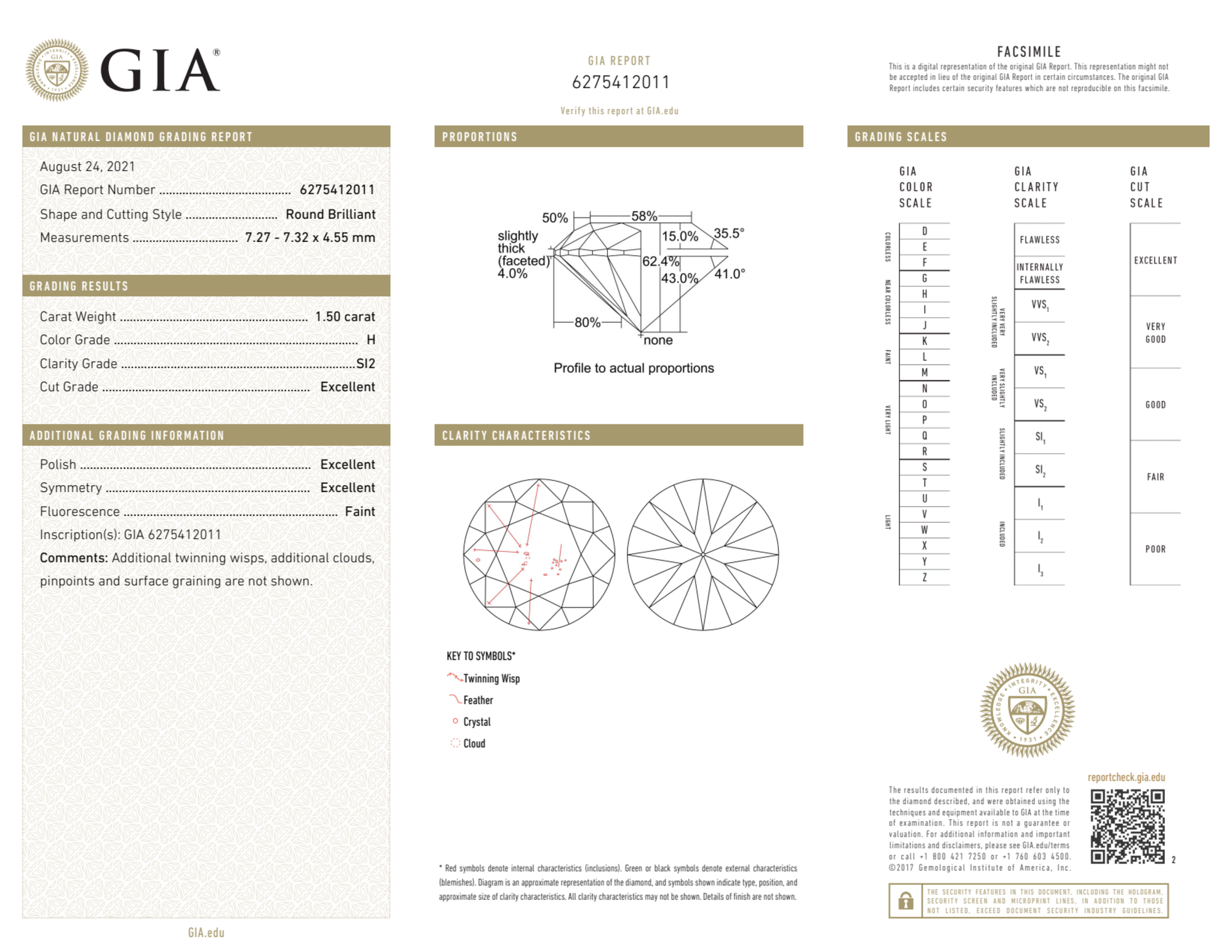 Your 1.50 carat Round natural diamond is graded SI2 clarity, which stands for Slightly Included 2. Read more about SI2 clarity diamonds here, or learn more about diamond clarity in general here.