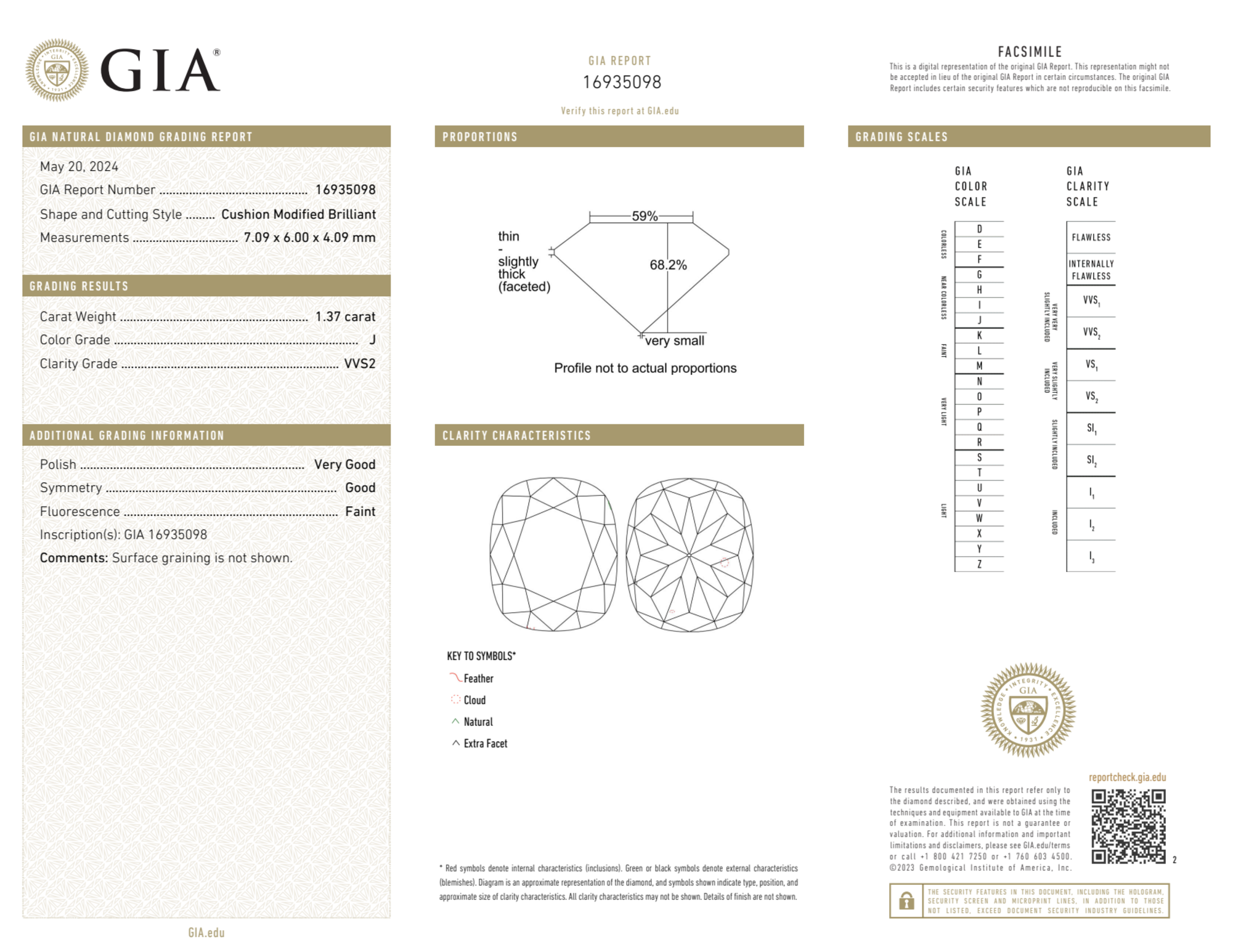 Your 1.37 carat Cushion natural diamond is graded VVS2 clarity, which stands for Very Very Slightly Included 2. Read more about VVS2 clarity diamonds here, or learn more about diamond clarity in general here.