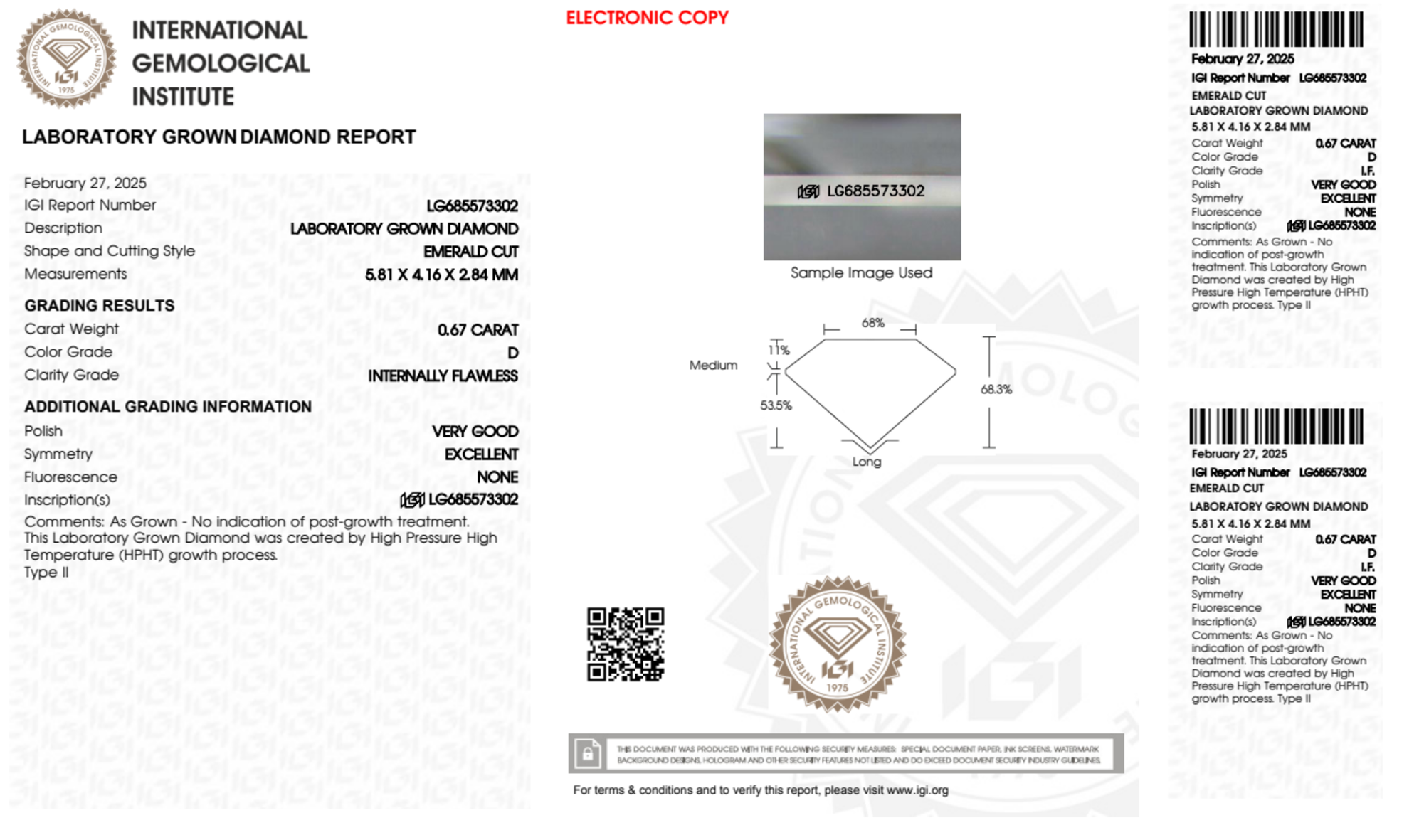 Your 0.67 carat Emerald lab diamond is graded IF clarity, which stands for Internally Flawless. Read more about IF clarity diamonds here, or learn more about diamond clarity in general here.