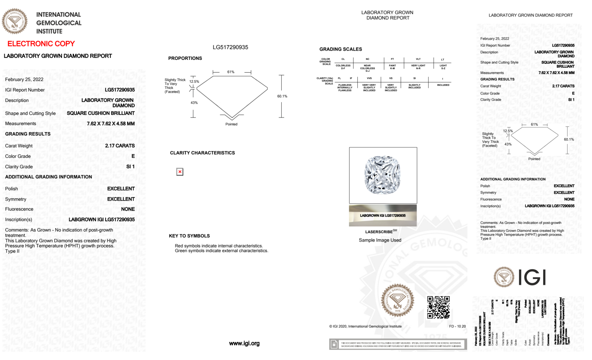Your 2.17 carat Cushion lab diamond is graded E color (Colorless), and you can read more about E color diamonds here.