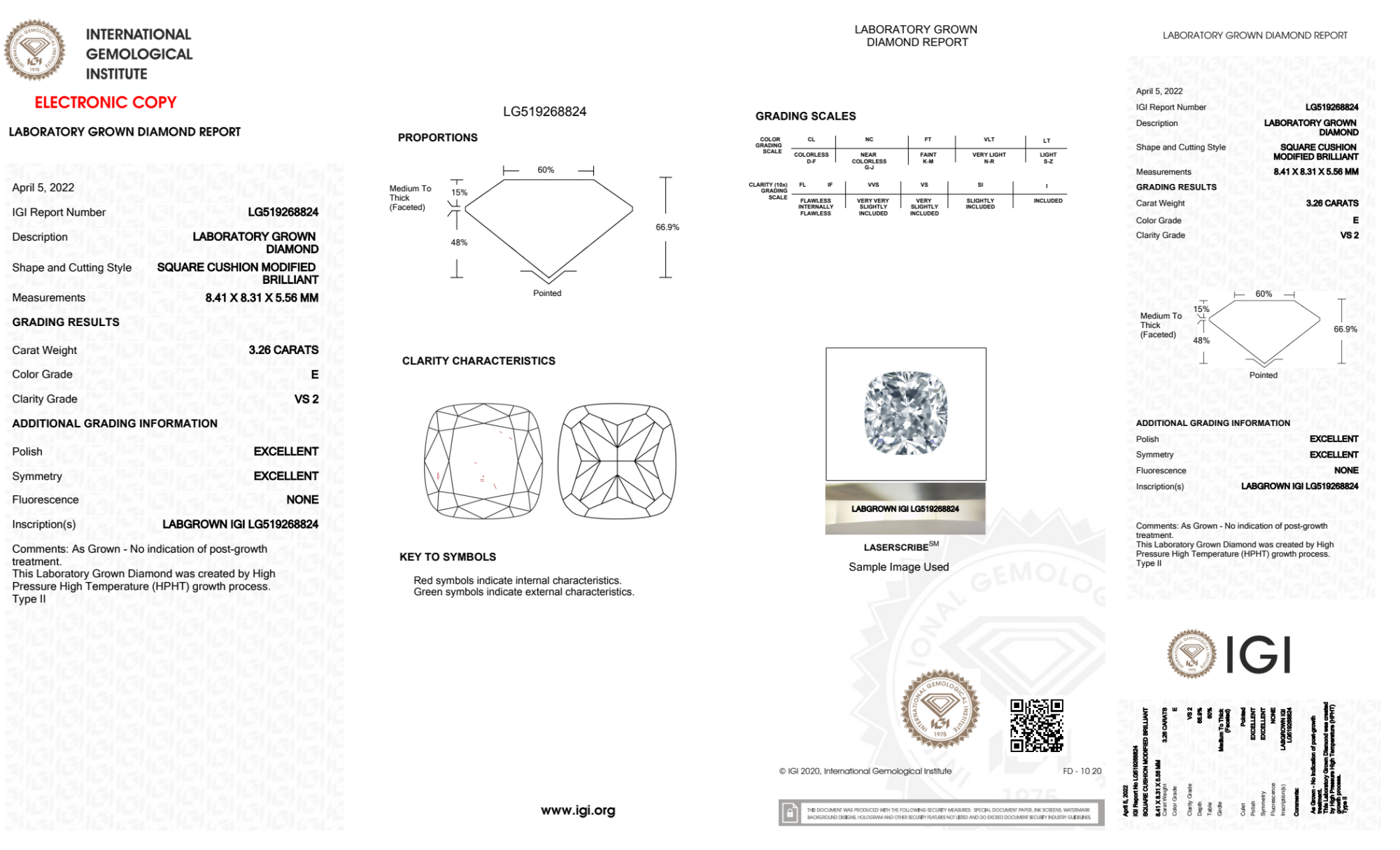 Your 3.26 carat Cushion lab diamond is graded E color (Colorless), and you can read more about E color diamonds here.