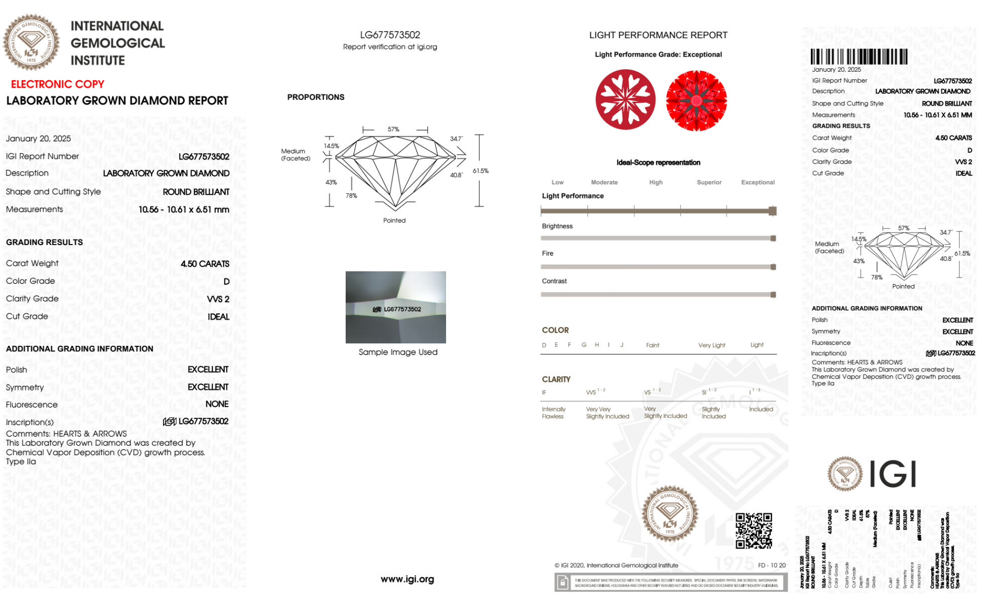 Your 4.50 carat Round lab diamond is graded D color (Colorless), and you can read more about D color diamonds here.