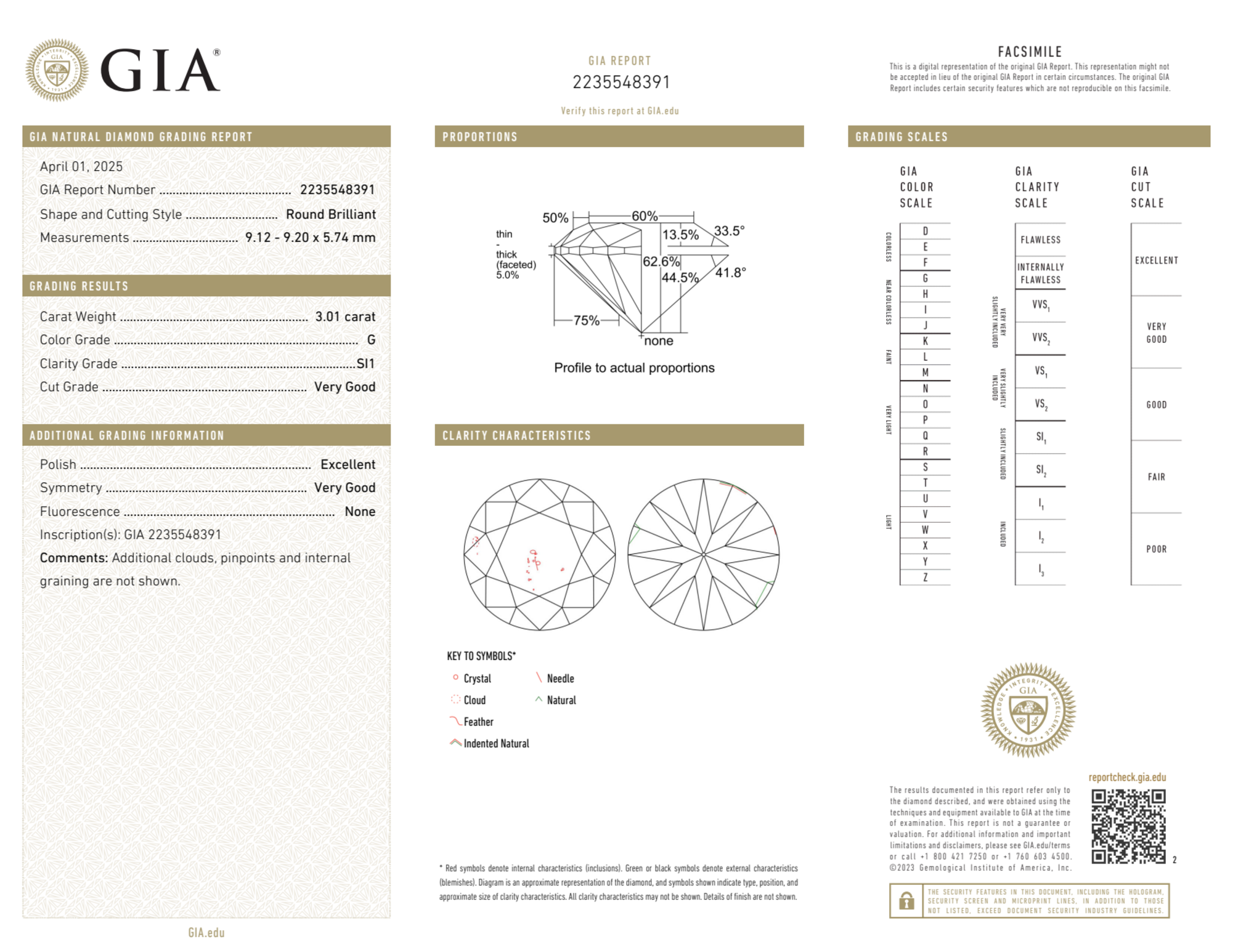 Your 3.01 carat Round natural diamond is graded G color (Near Colorless), and you can read more about G color diamonds here.