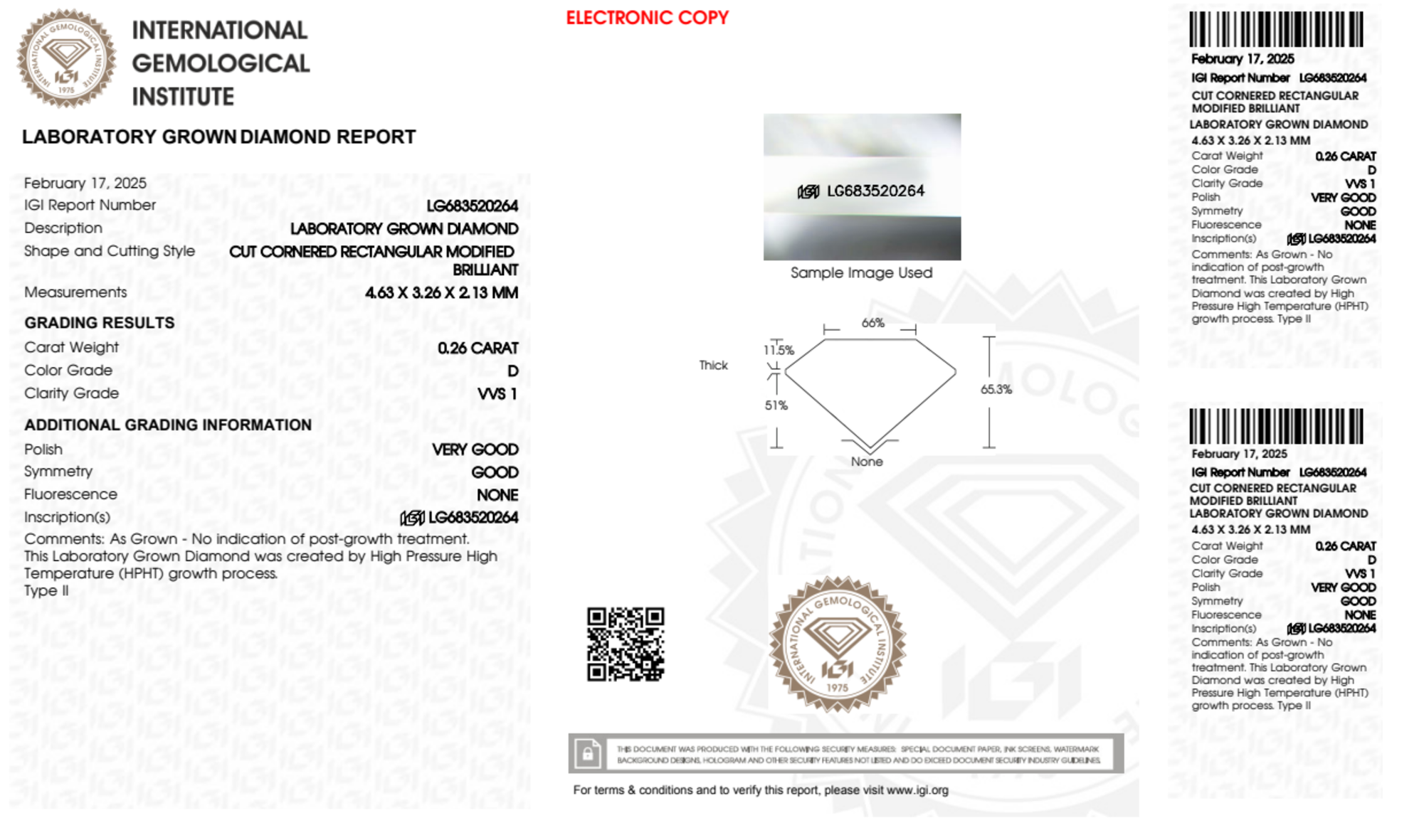 Your 0.26 carat Radiant lab diamond is graded D color (Colorless), and you can read more about D color diamonds here.