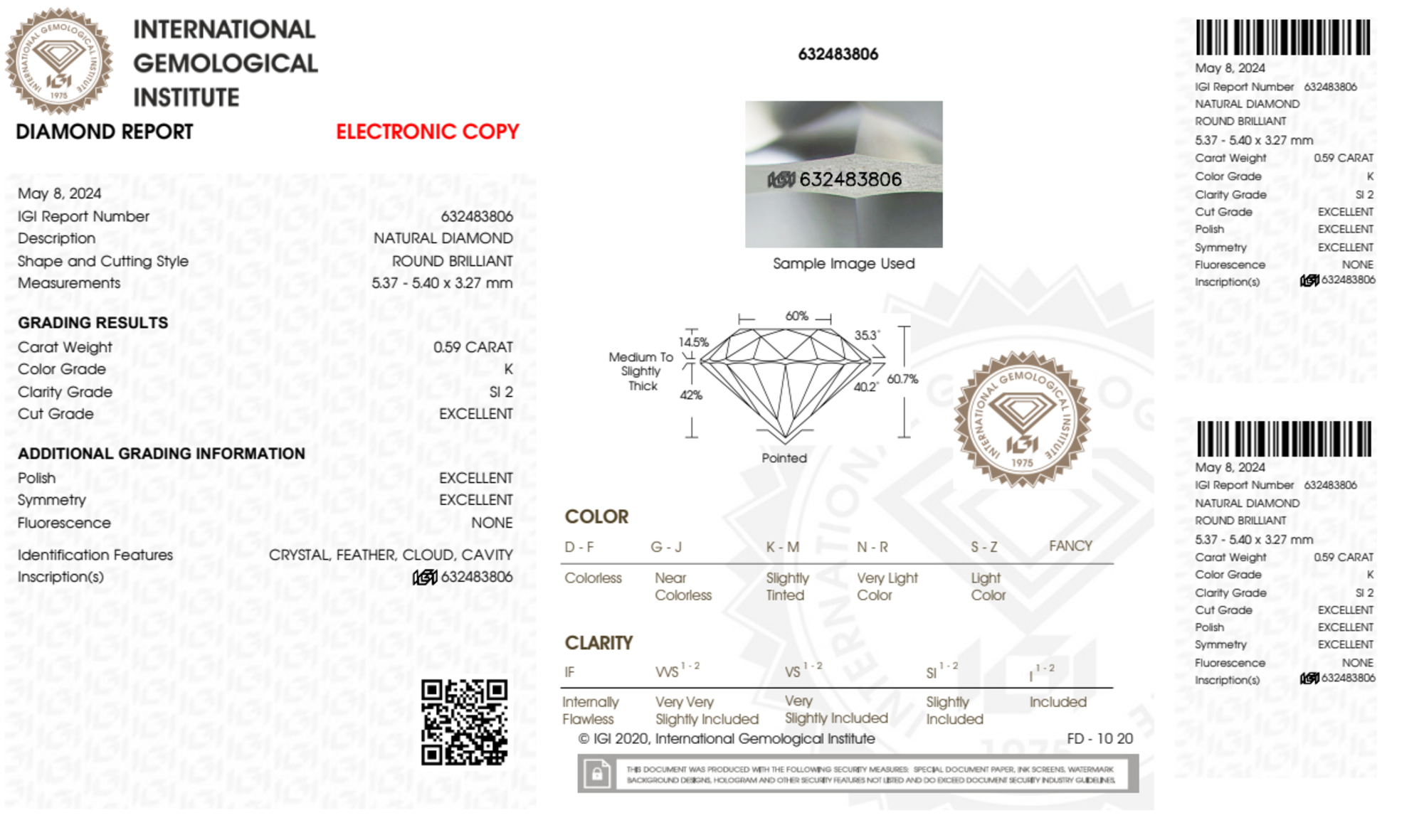 Your 0.59 carat Round natural diamond is graded SI2 clarity, which stands for Slightly Included 2. Read more about SI2 clarity diamonds here, or learn more about diamond clarity in general here.