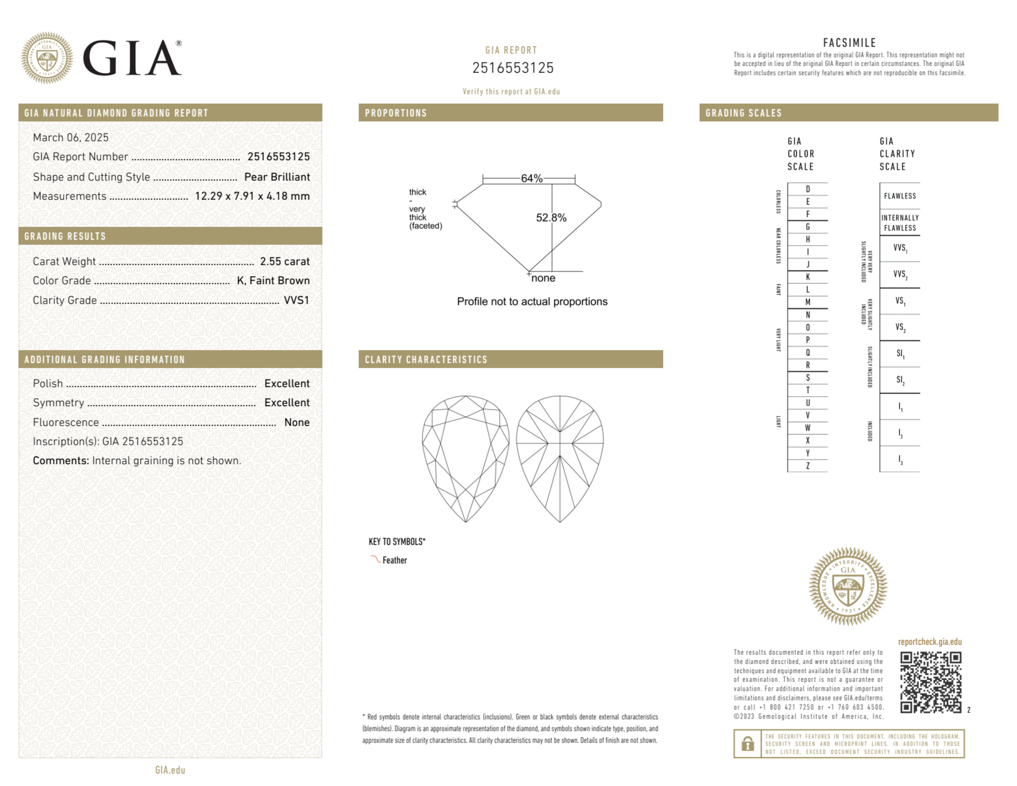 Your 2.55 carat Pear natural diamond is graded K color (Faint Color), and you can read more about K color diamonds here.