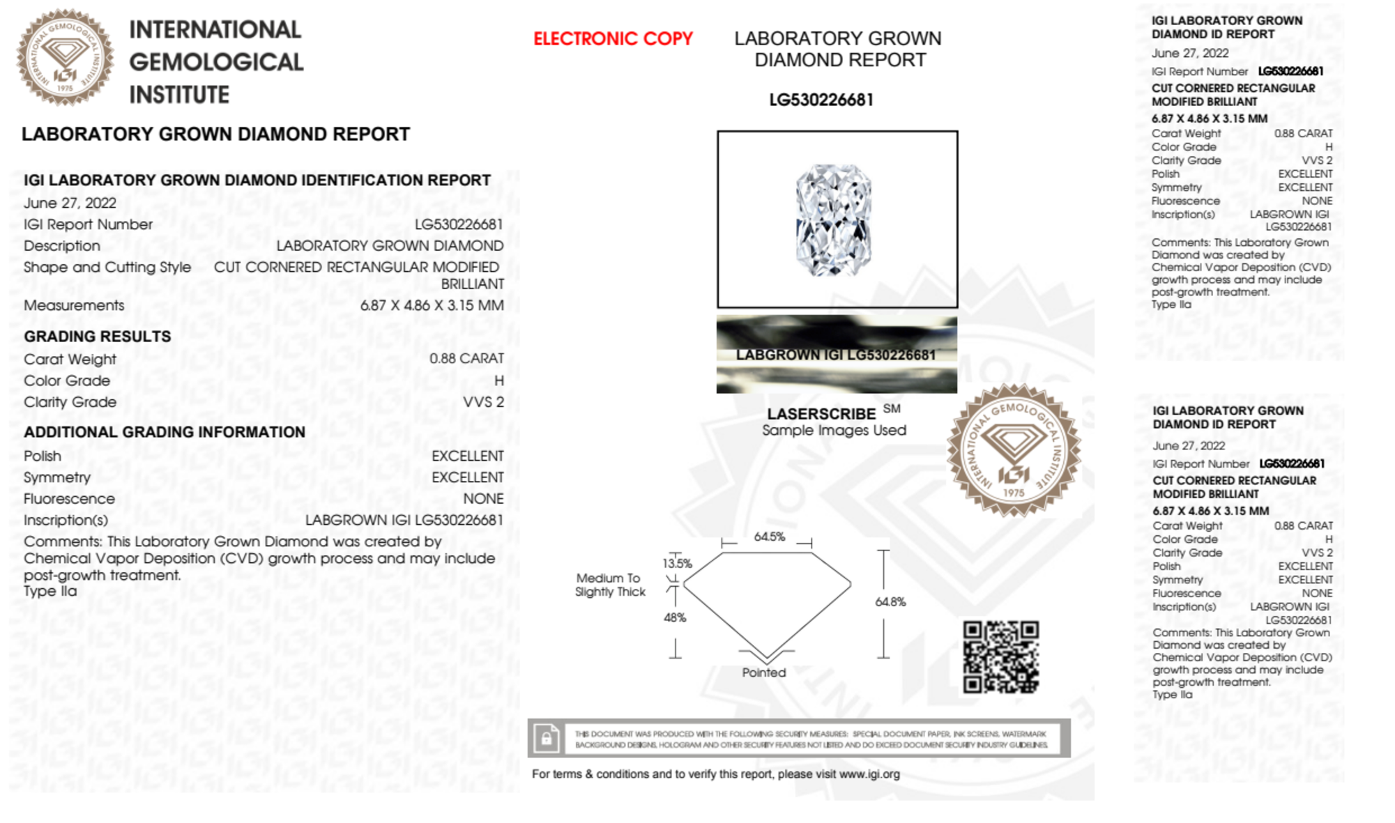 Your 0.88 carat Radiant lab diamond is graded H color (Near Colorless), and you can read more about H color diamonds here.