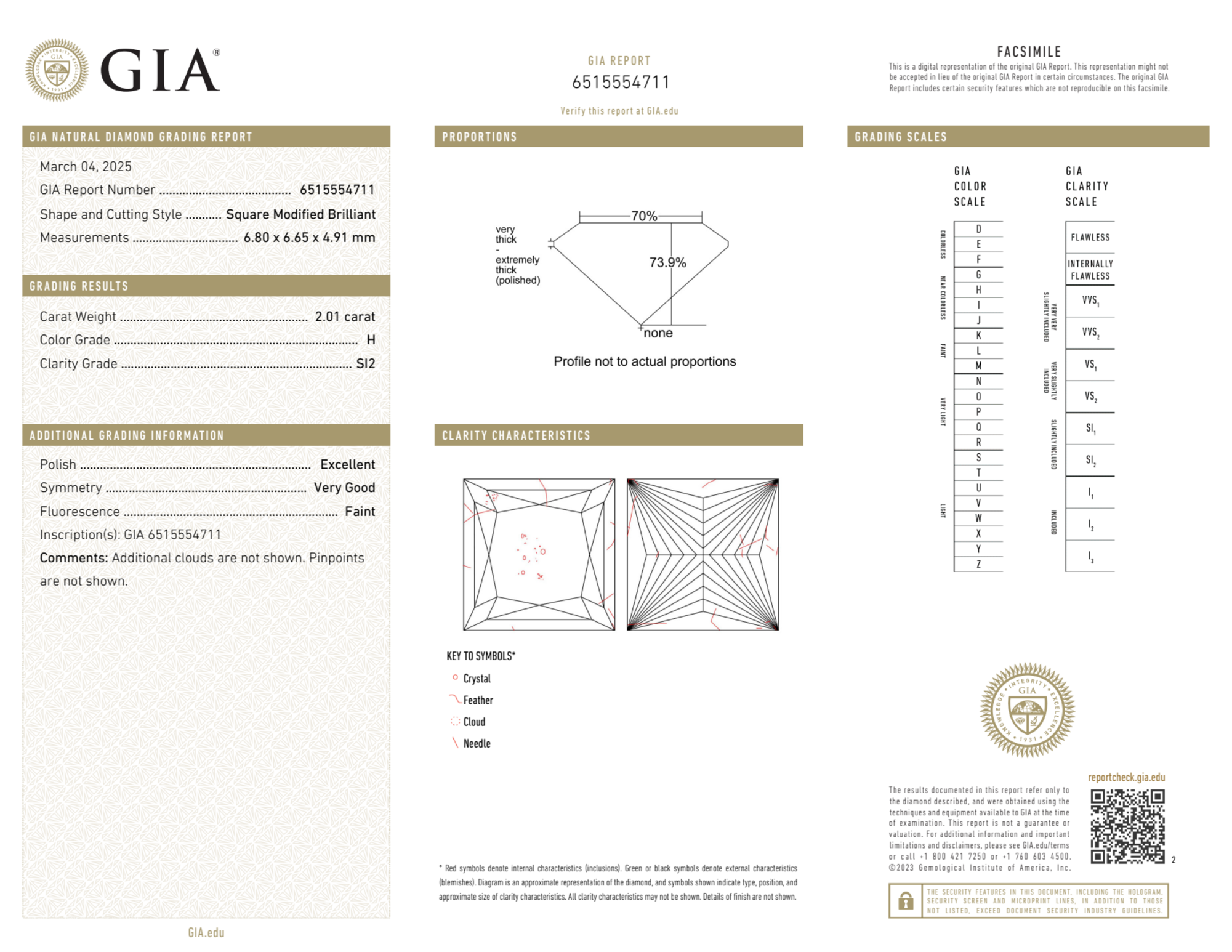 Your 2.01 carat Princess natural diamond is graded SI2 clarity, which stands for Slightly Included 2. Read more about SI2 clarity diamonds here, or learn more about diamond clarity in general here.