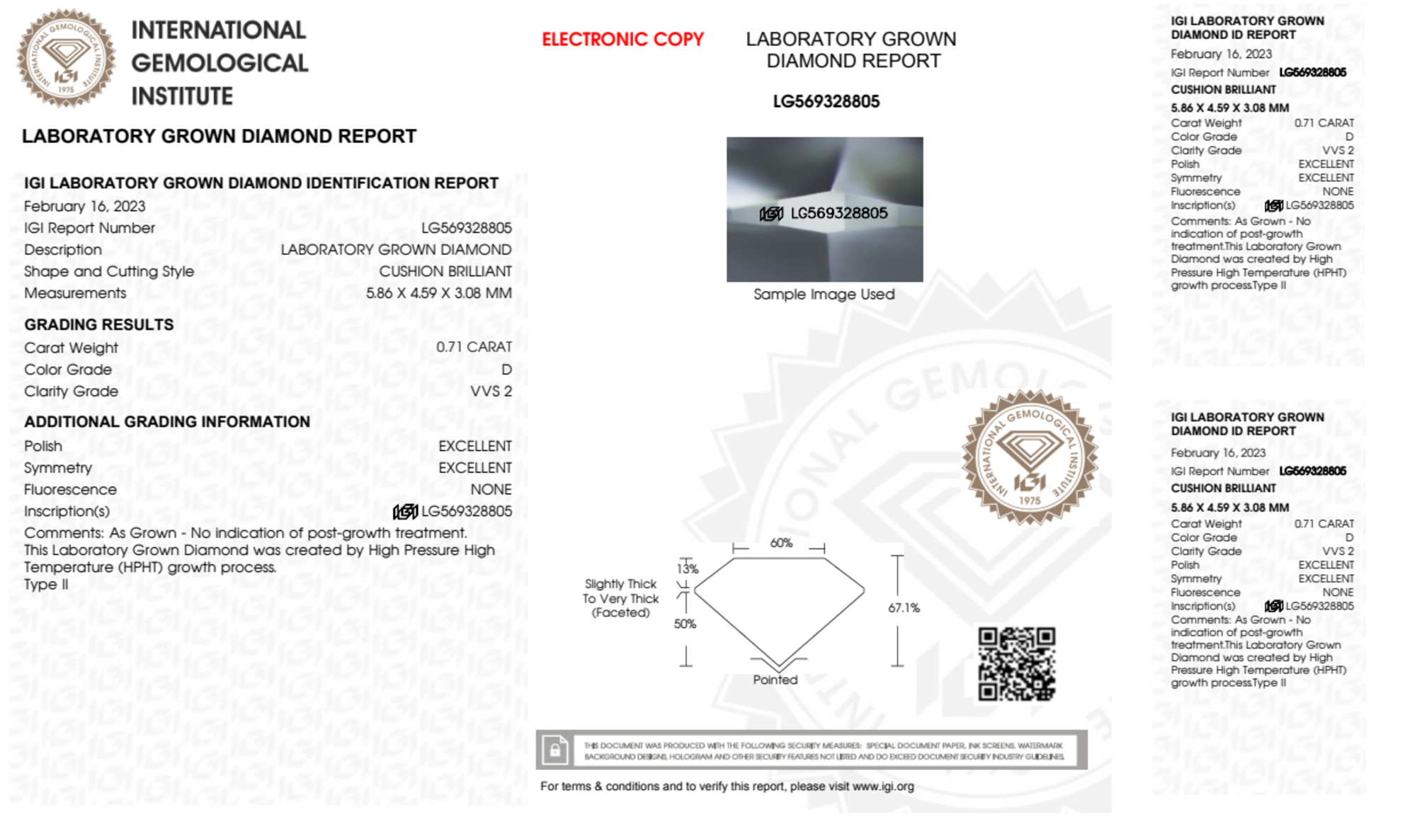 Your 0.71 carat Cushion lab diamond is graded D color (Colorless), and you can read more about D color diamonds here.