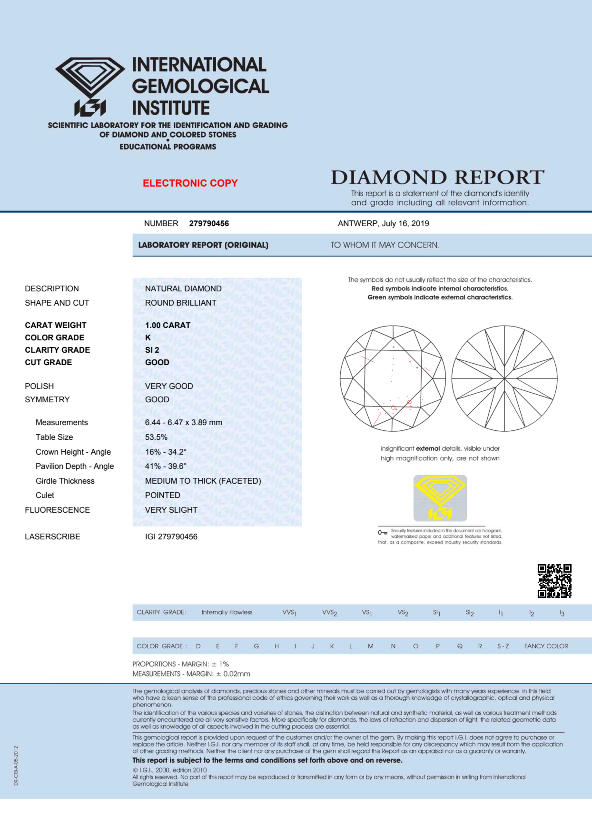 Your 1.00 carat Round natural diamond is graded SI2 clarity, which stands for Slightly Included 2. Read more about SI2 clarity diamonds here, or learn more about diamond clarity in general here.