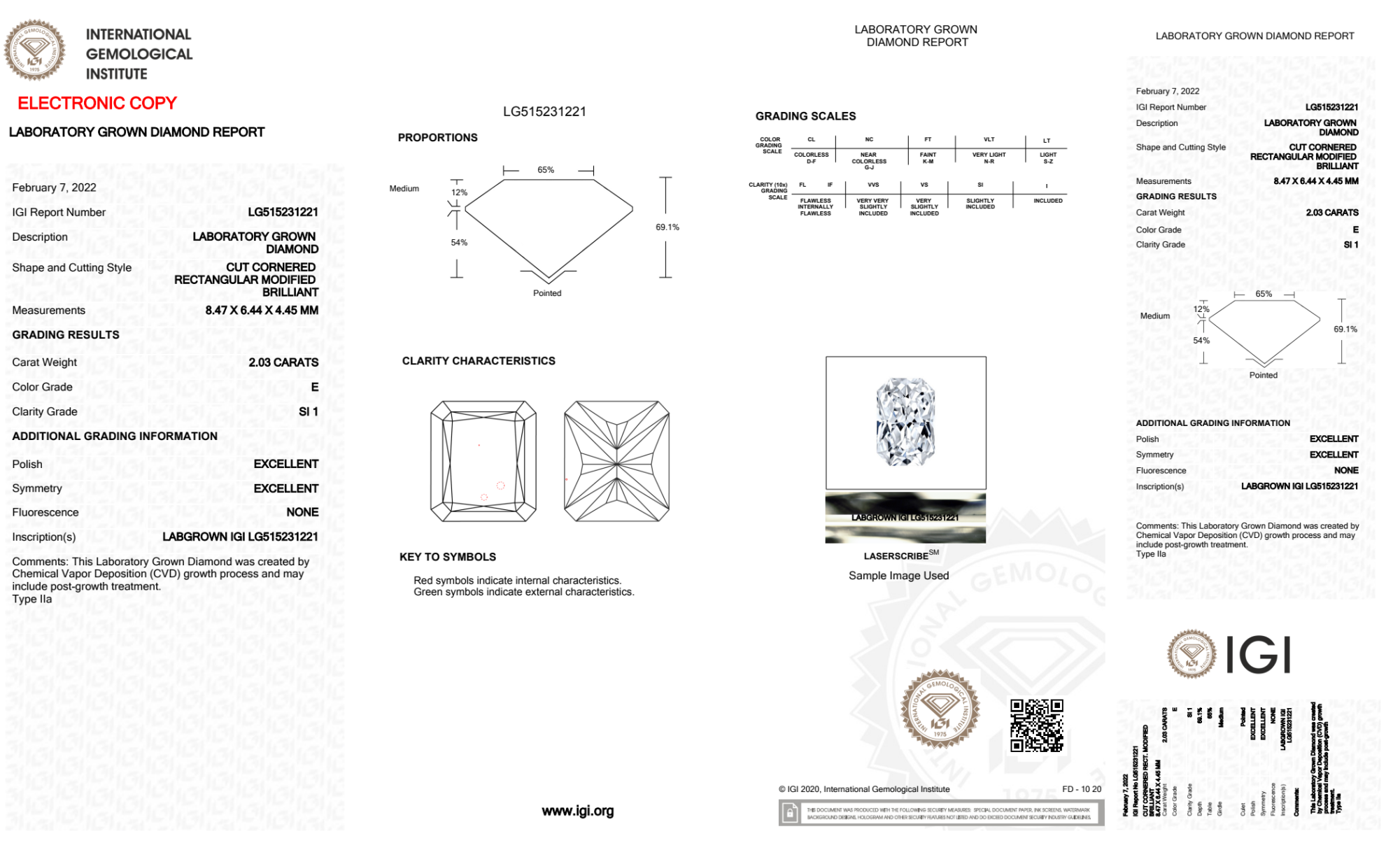 Your 2.03 carat Radiant lab diamond is graded E color (Colorless), and you can read more about E color diamonds here.