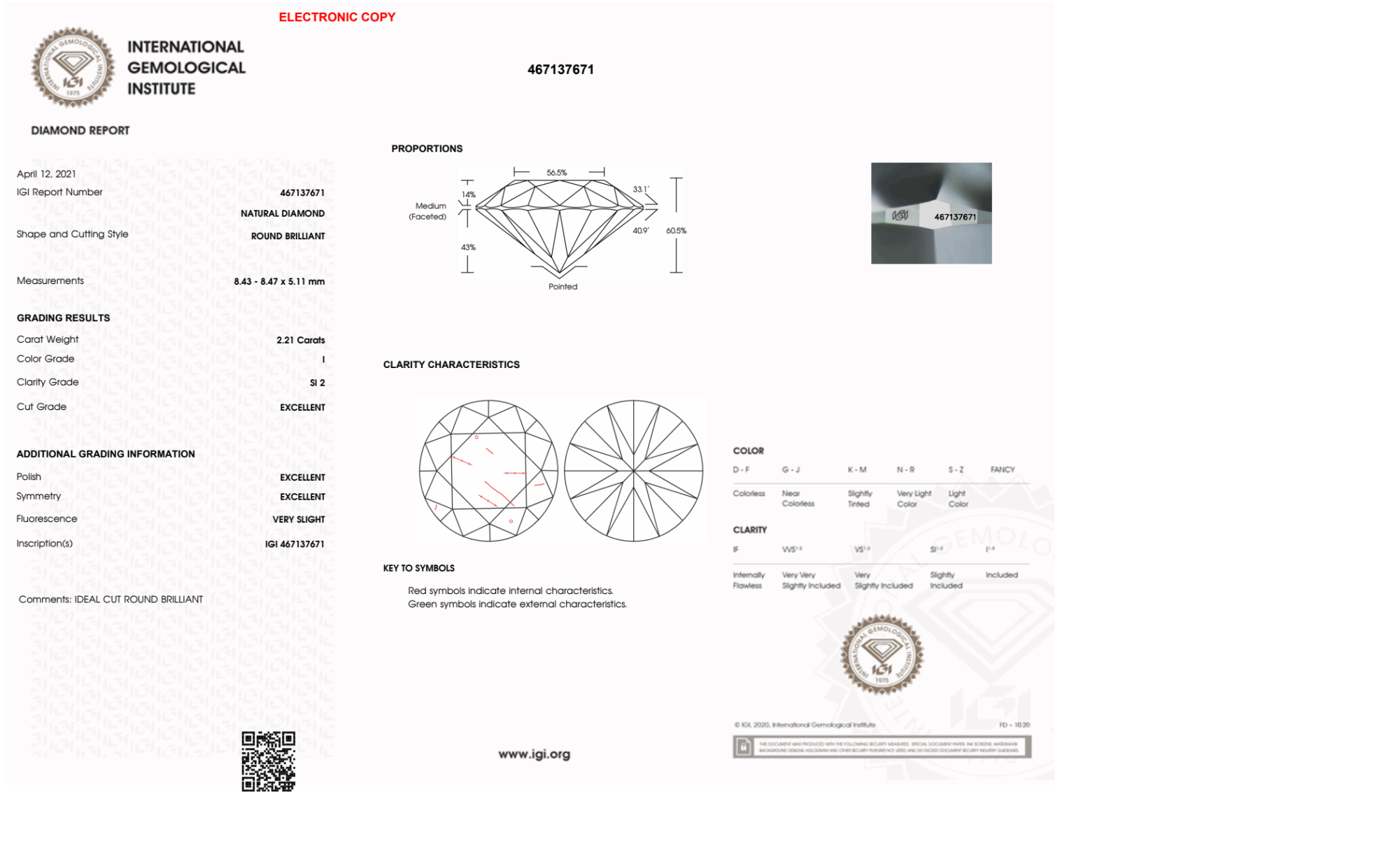 Your 2.21 carat Round natural diamond is graded SI2 clarity, which stands for Slightly Included 2. Read more about SI2 clarity diamonds here, or learn more about diamond clarity in general here.