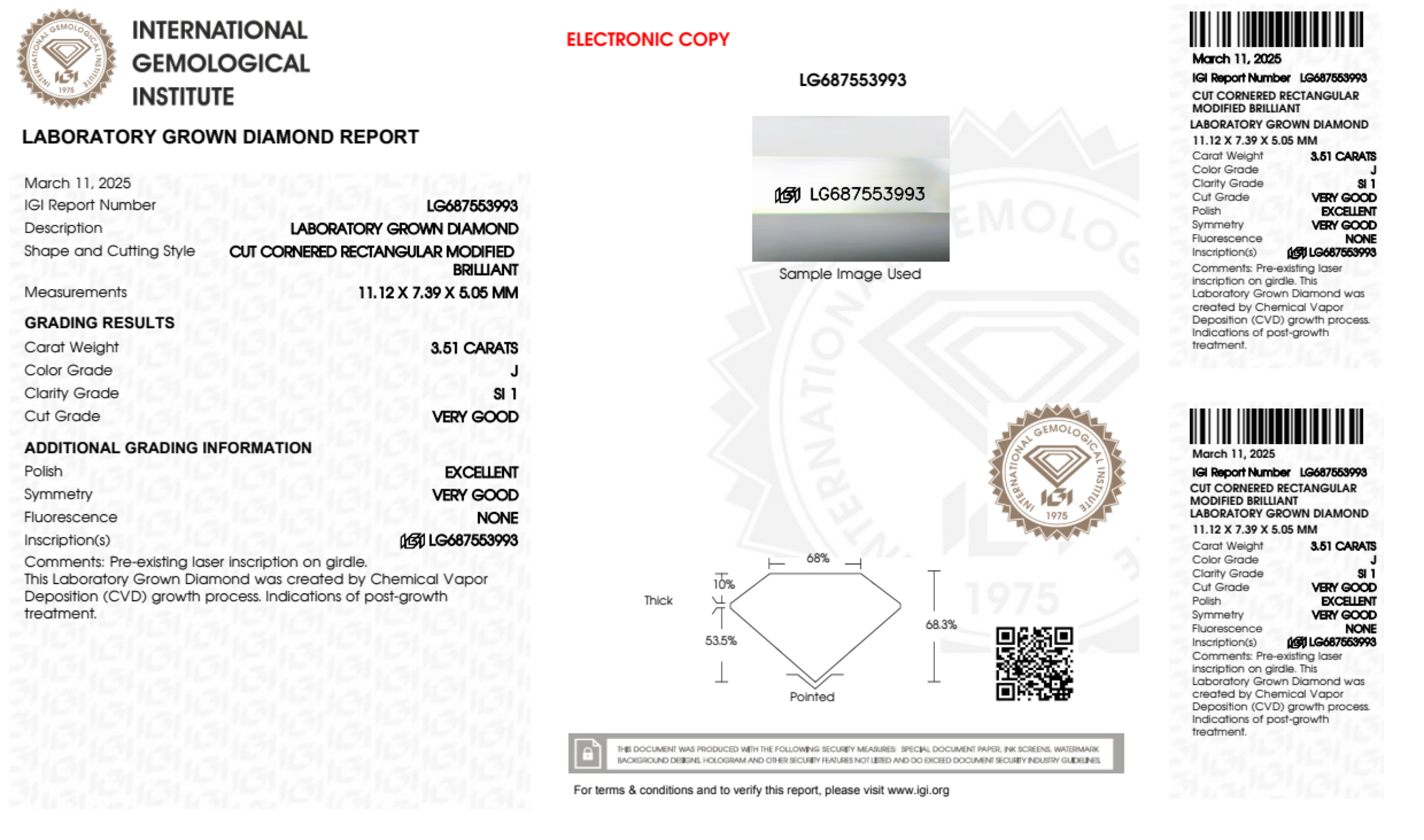 Your 3.51 carat Radiant lab diamond is graded J color (Near Colorless), and you can read more about J color diamonds here.