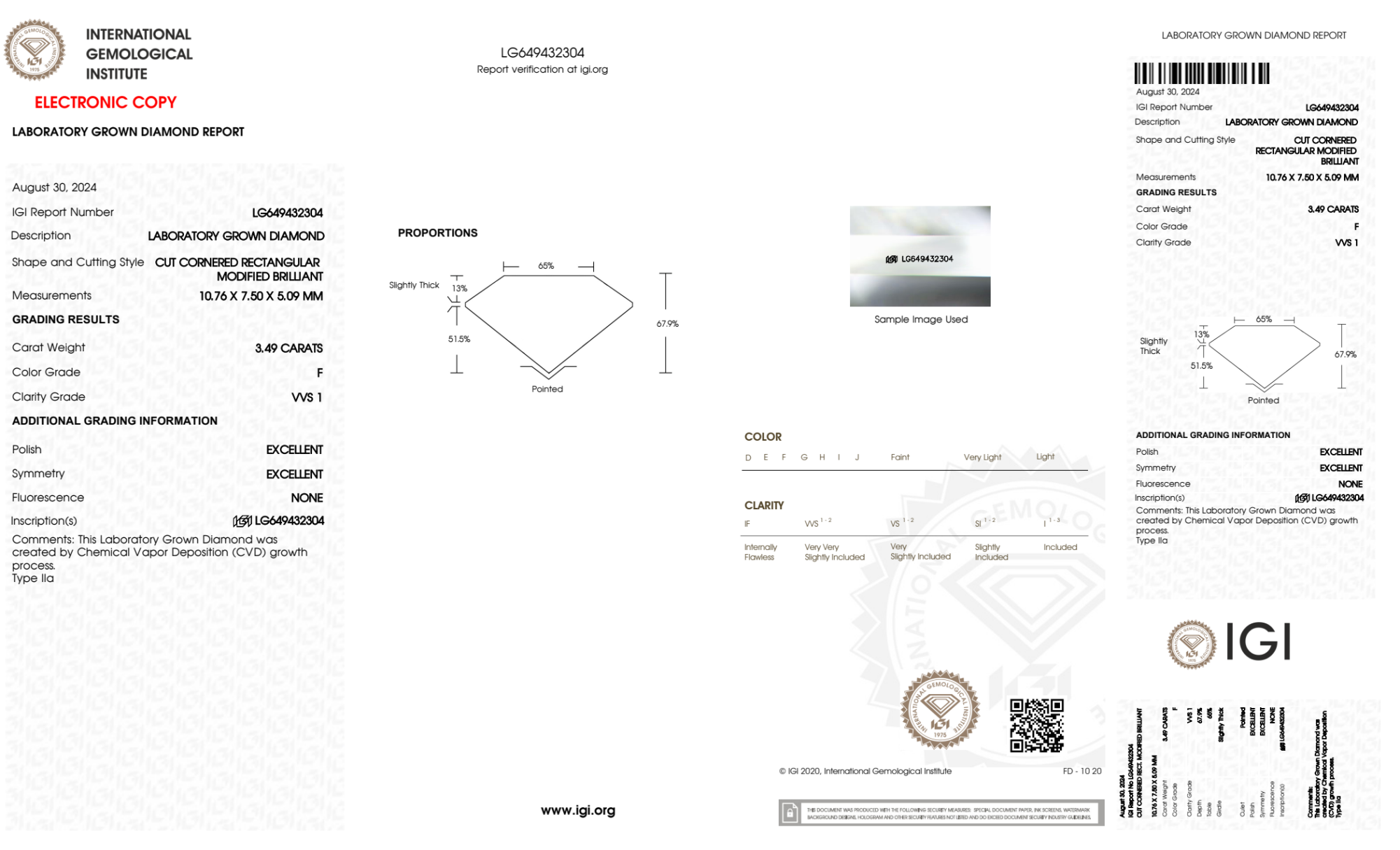 Your 3.49 carat Radiant lab diamond is graded F color (Colorless), and you can read more about F color diamonds here.
