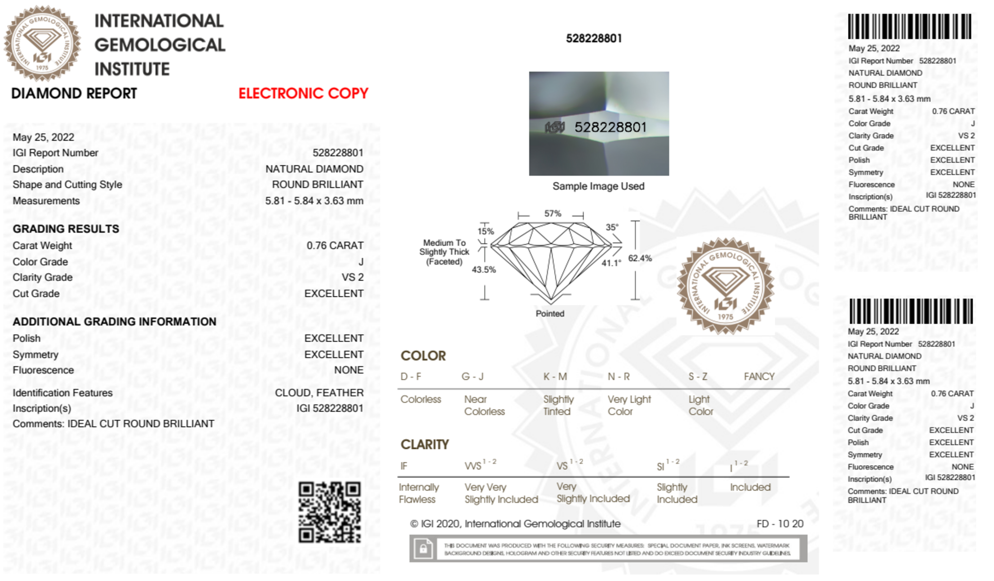 Your 0.76 carat Round natural diamond is graded J color (Near Colorless), and you can read more about J color diamonds here.
