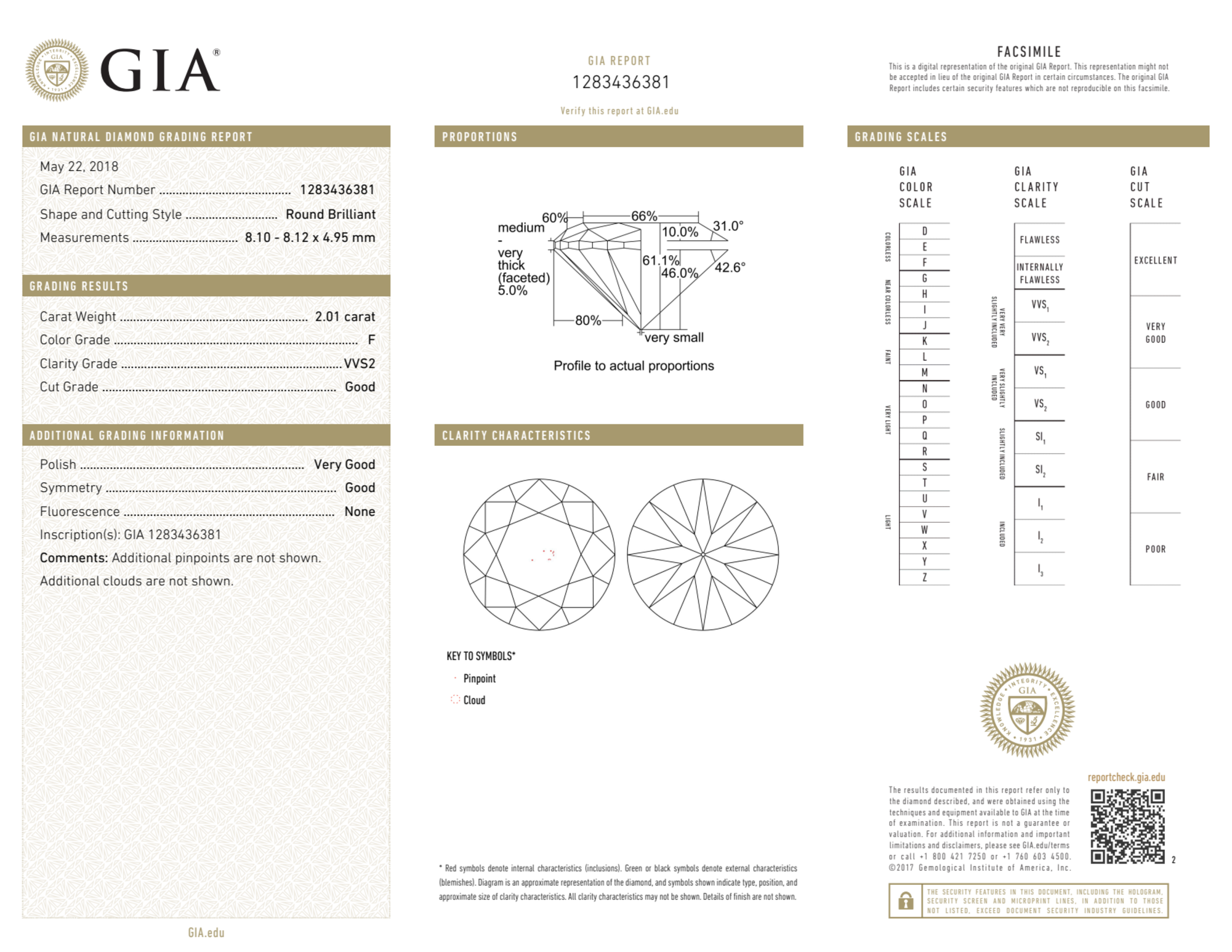 Your 2.01 carat Round natural diamond is graded F color (Colorless), and you can read more about F color diamonds here.