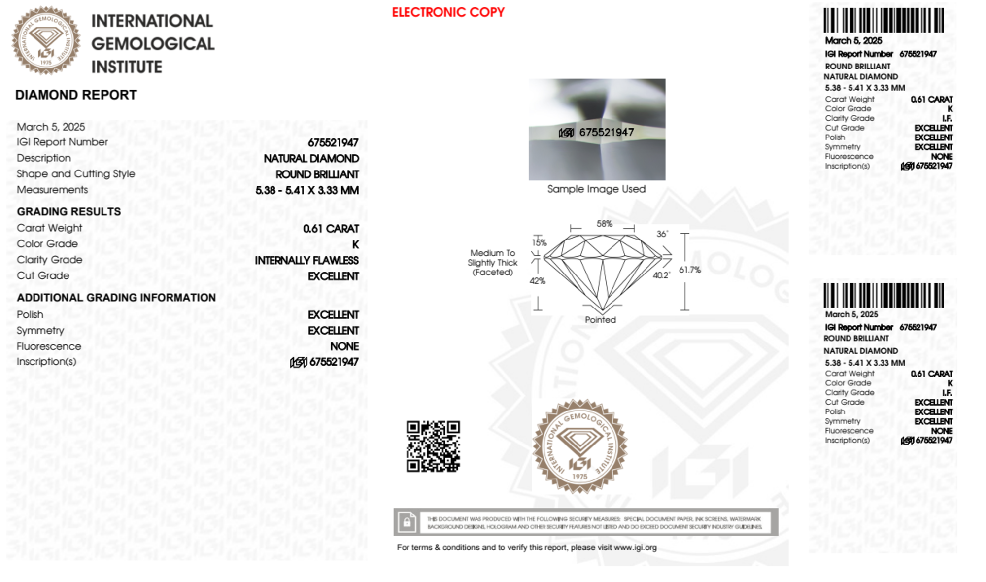 Your 0.61 carat Round natural diamond is graded IF clarity, which stands for Internally Flawless. Read more about IF clarity diamonds here, or learn more about diamond clarity in general here.