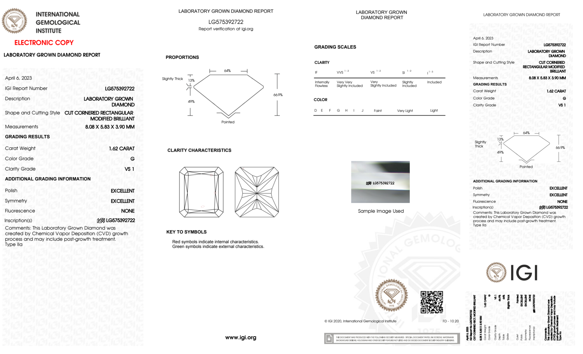 Your 1.62 carat Radiant lab diamond is graded G color (Near Colorless), and you can read more about G color diamonds here.