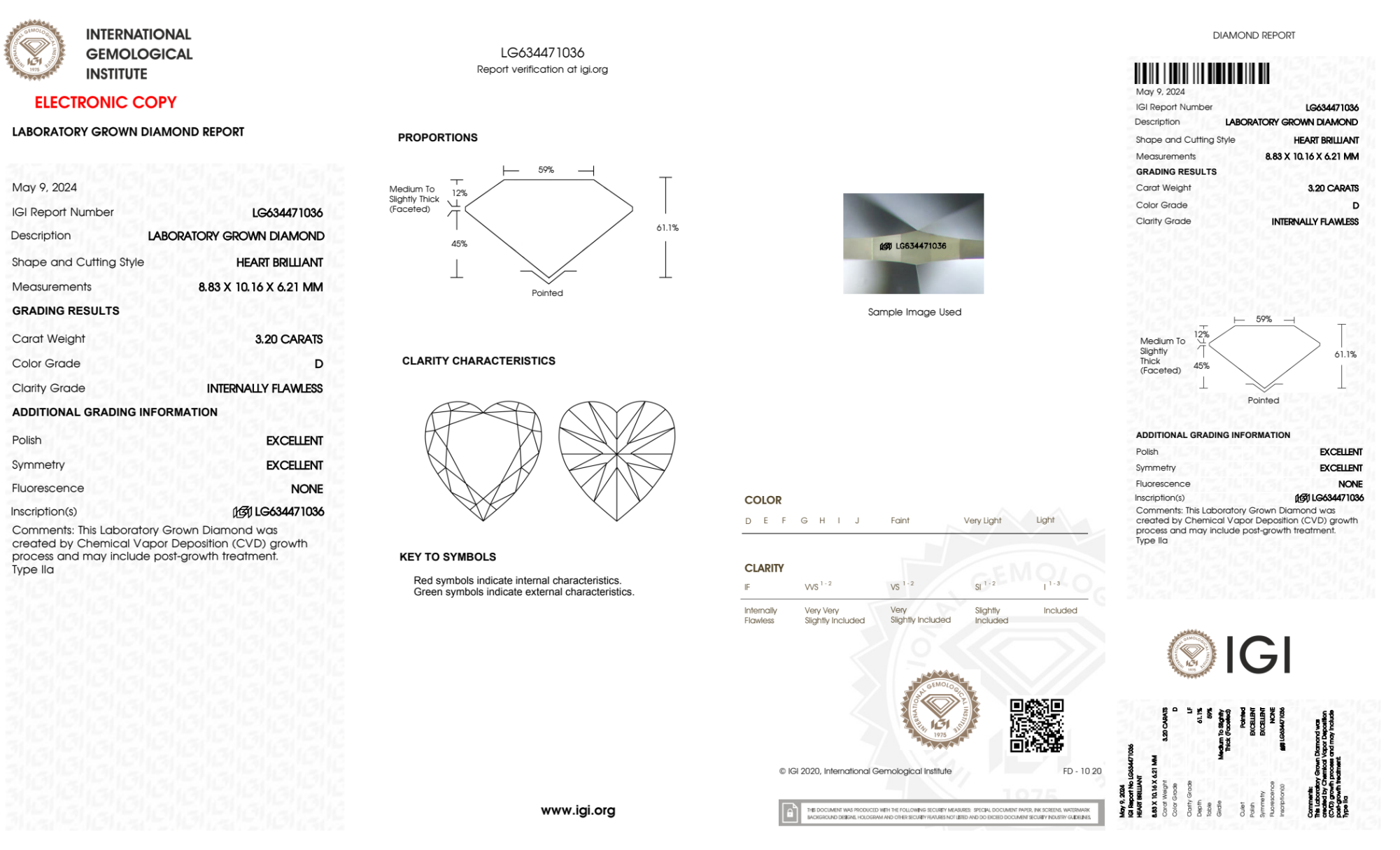Your 3.20 carat Heart lab diamond is graded IF clarity, which stands for Internally Flawless. Read more about IF clarity diamonds here, or learn more about diamond clarity in general here.