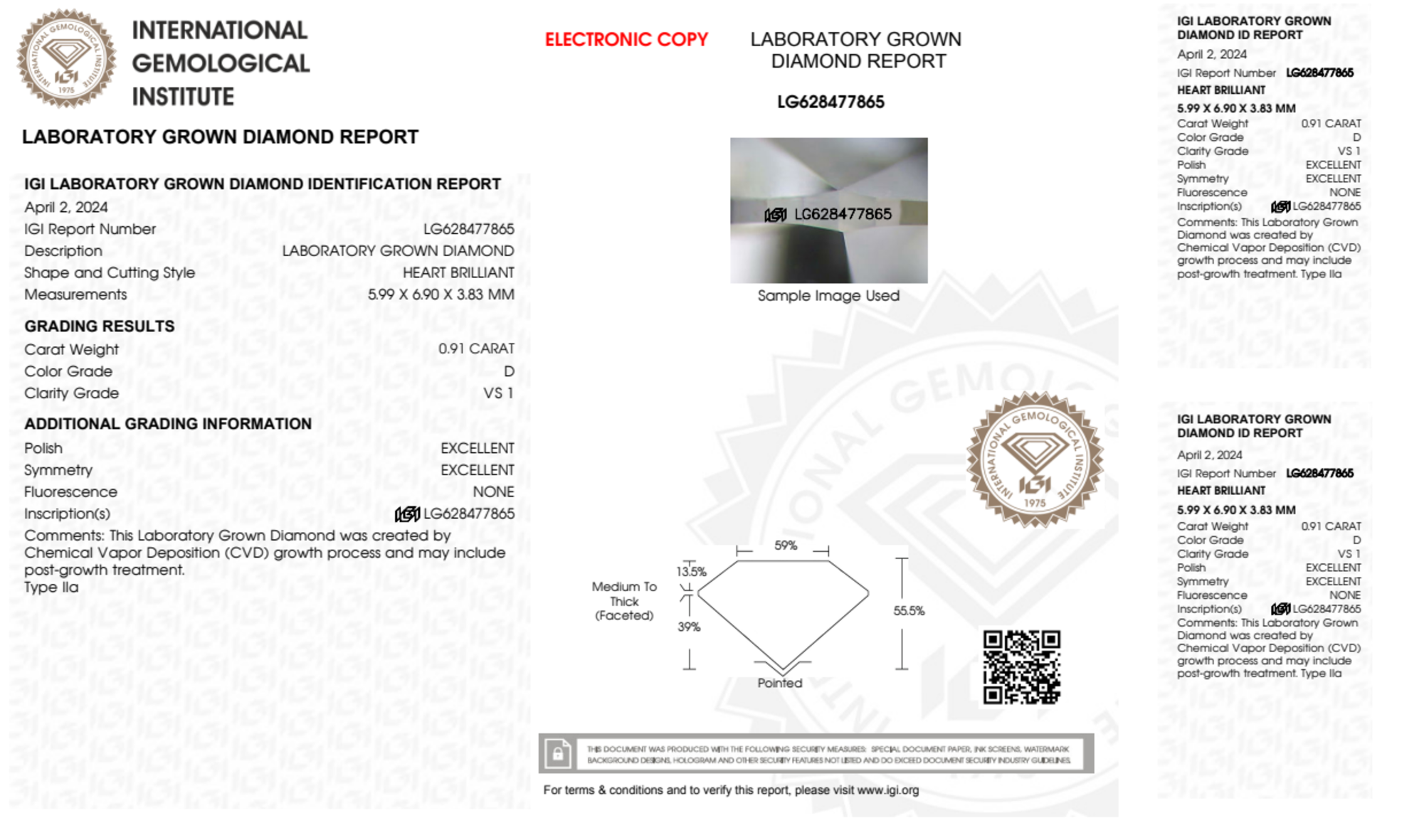 Your 0.91 carat Heart lab diamond is graded D color (Colorless), and you can read more about D color diamonds here.