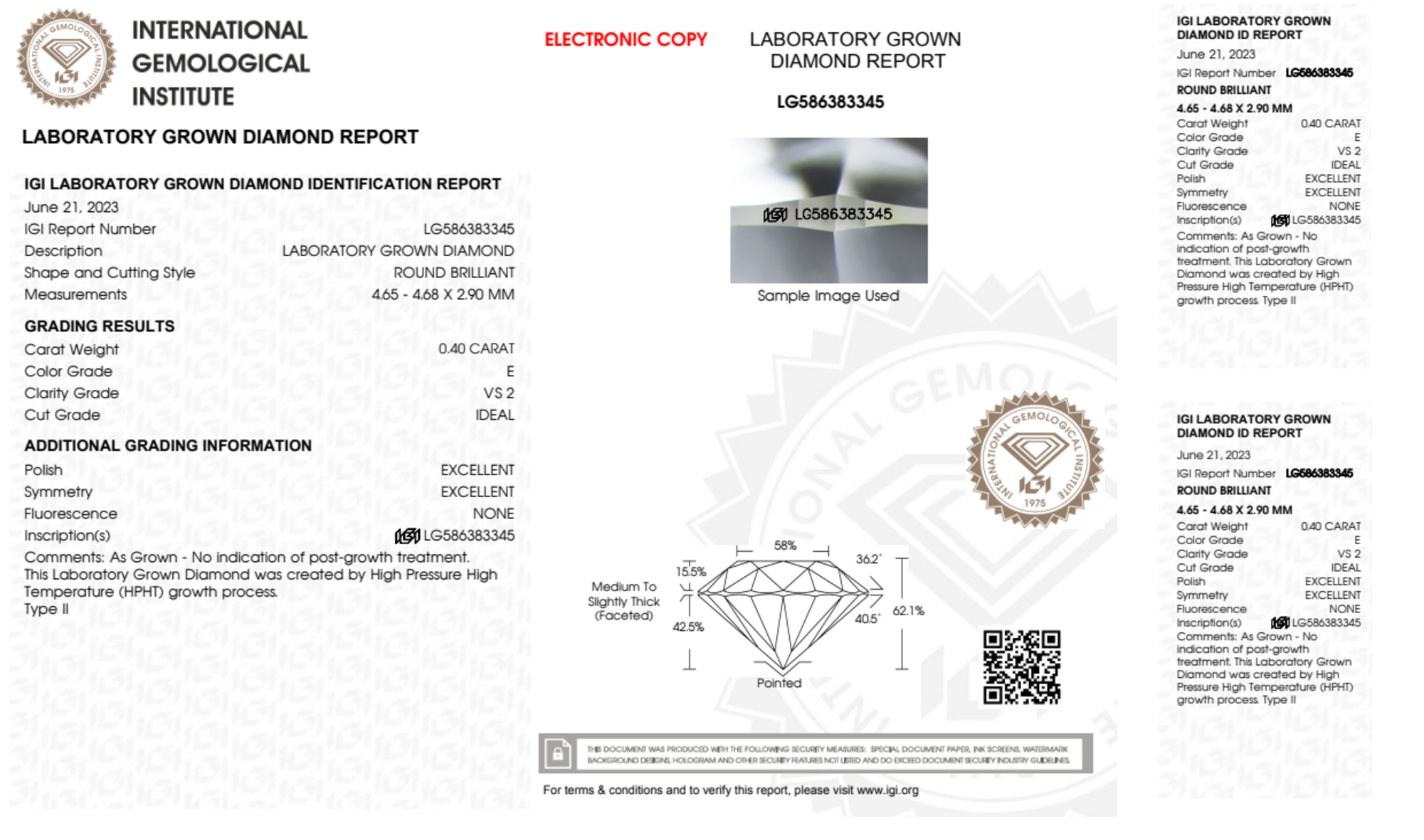 Your 0.40 carat Round lab diamond is graded E color (Colorless), and you can read more about E color diamonds here.