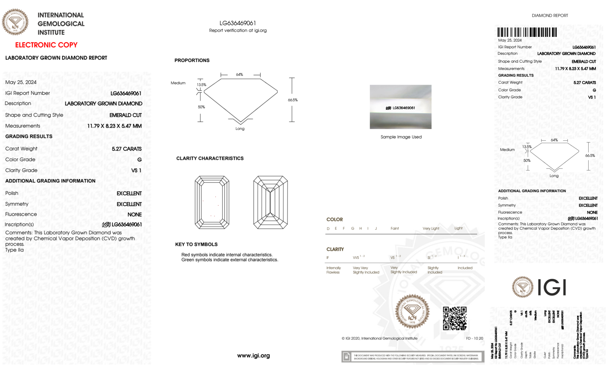 Your 5.27 carat Emerald lab diamond is graded G color (Near Colorless), and you can read more about G color diamonds here.