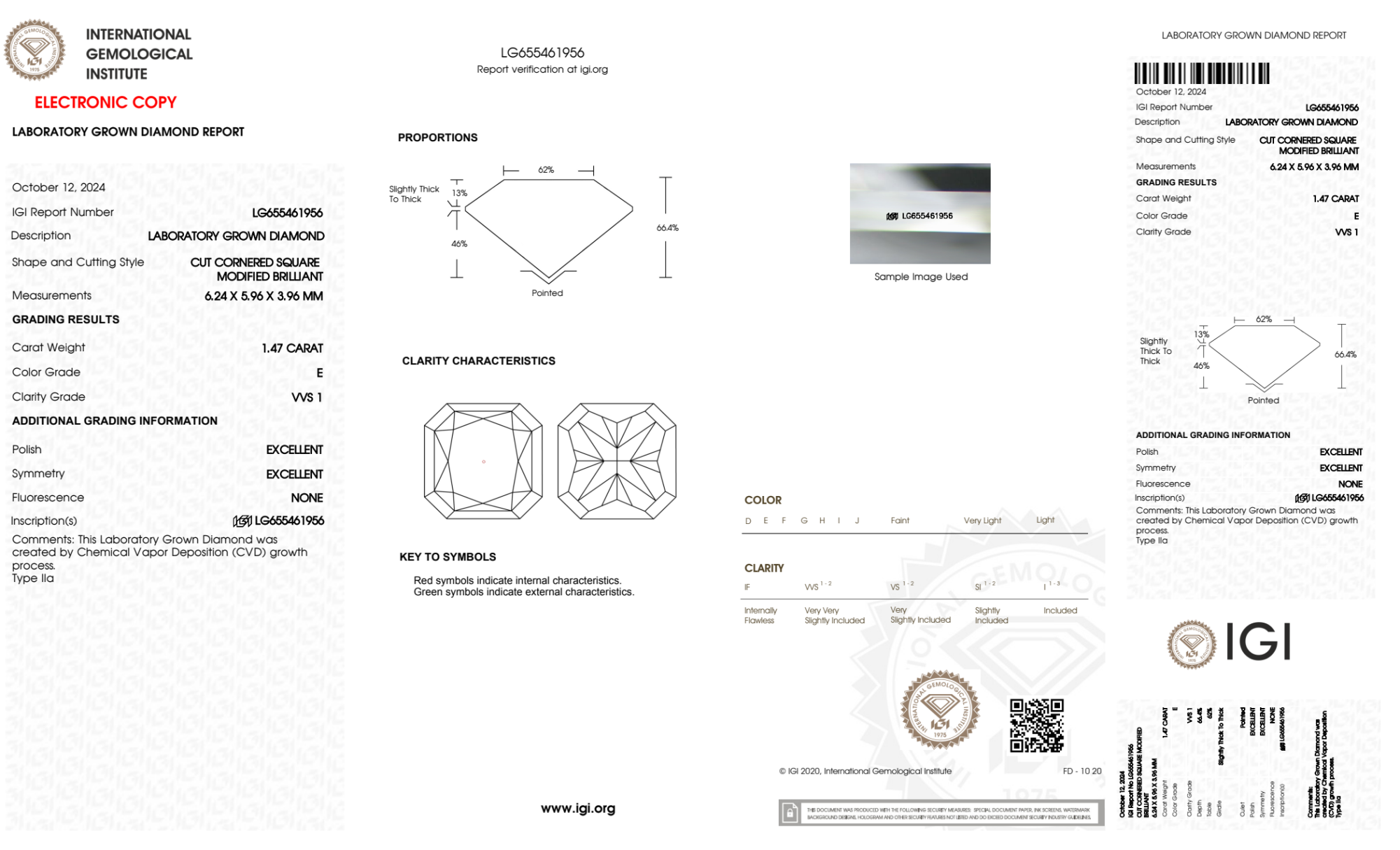 Your 1.47 carat Radiant lab diamond is graded E color (Colorless), and you can read more about E color diamonds here.