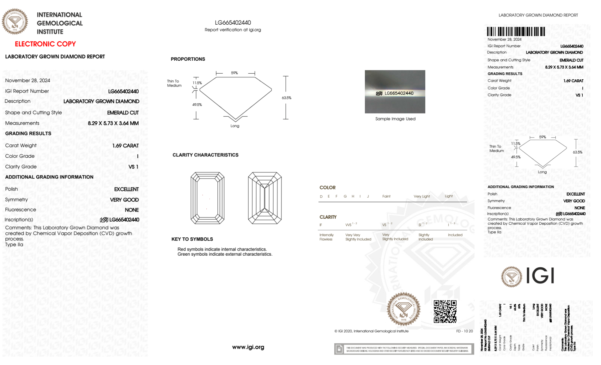 Your 1.69 carat Emerald lab diamond is graded VS1 clarity, which stands for Very Slightly Included 1. Read more about VS1 clarity diamonds here, or learn more about diamond clarity in general here.